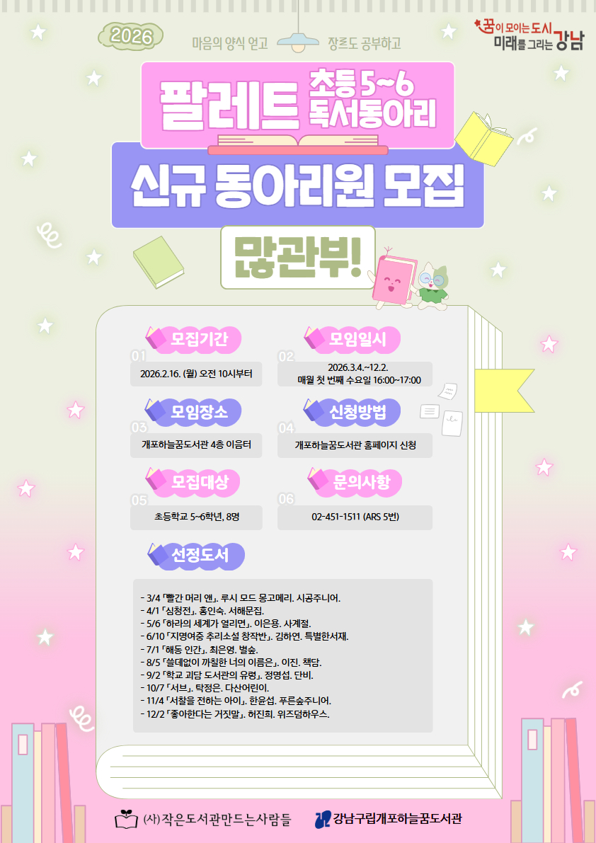 ★ 팔레트는 2026년 기준, 초등학교 5~6학년을 대상으로 모집합니다★ <팔레트>는 다양한 장르의 도서들을 읽으며 친구들과 즐겁게 이야기를 나누고 활동하는 동아리입니다. 여러분이 알지 못했던 장르를 탐구하며 최애 장르를 찾고 싶은 초등학교 5~6학년 친구들을 모집합니다! ![]() ![]() ※프로그램 신청시 참여자 본인의 아이디로 신청 하셔야 합니다. ※프로그램 신청 시 홍보용 사진 촬영 및 사용에 동의하시는 것으로 간주됩니다. ※프로그램 관련 공지사항은 문자로 발송되오니 회원가입 시 입력된 휴대폰번호 확인 부탁드립니다. ○일 시 : 2026. 3. 4. ~ 12. 2. 매월 첫 번째 수요일 16:00~17:00 ○대 상 : 초등학교 5~6학년 ○장 소 : 개포하늘꿈도서관 4층 이음터 ○신 청 방 법 : 개포하늘꿈도서관 홈페이지 ○문 의 : 02-451-1511 |