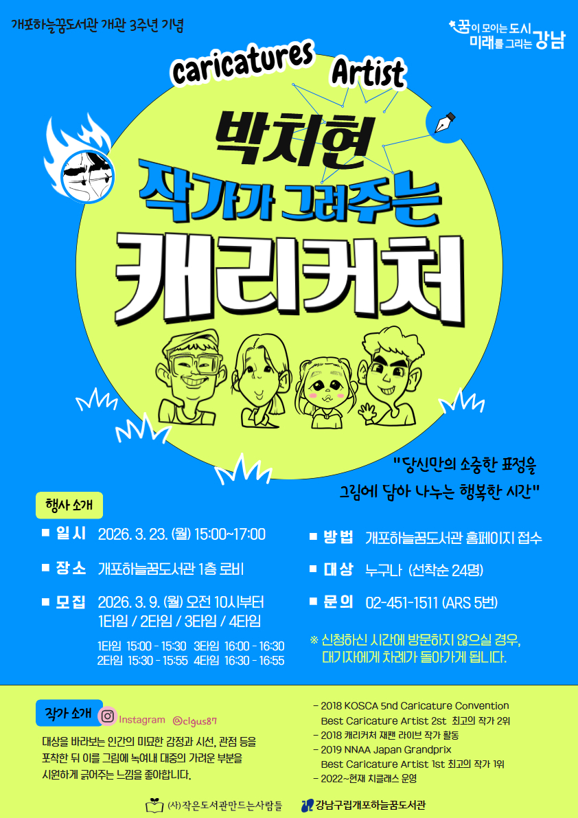 개포하늘꿈도서관 개관 3주년 기념 "당신만의 소중한 표정을 그림에 담아 나누는 행복한 시간" 박치현 작가가 그려주는 캐리커처 이벤트 ★ 1타임 신청 페이지 입니다. ★ - 일시 : 3월 23일 (월) 15:00~15:30 시간을 반드시 확인해 주세요. - 신청하신 시간에 방문하지 않으신 경우, 현장의 대기자에게 차례가 돌아가게 됩니다. - 1타임 신청자는 다음 타임(2~4타임) 중복 신청이 불가합니다. - 캐리커처는 1인 1장으로 그려드립니다. (1장 2인 캐리커처 불가) - 해당 프로그램은 강남구립도서관 회원카드 소지자만 신청할 수 있습니다. ![]() ![]() ○ 장소 : 개포하늘꿈도서관 1층 로비 ○ 일시 : 2026년 3월 23일 (월) 15:00~15:30 ○ 대상 : 누구나 (선착순 24명) / 타임별 6명 ○ 접수 : 2026년 3월 9일 (월) 오전 10시 ~ 선착순 ○ 신청방법 : 개포하늘꿈도서관 홈페이지 온라인 접수 ○ 문의 : 02-451-1511 / ARS 5번 ※ 프로그램 신청시 참여자 본인의 아이디로 신청 하셔야 합니다. ※ 프로그램 신청 시 홍보용 사진 촬영 및 사용에 동의하시는 것으로 간주됩니다. ※ 프로그램 관련 공지사항은 문자로 발송되오니 회원가입 시 입력된 휴대폰번호 확인 부탁드립니다. |