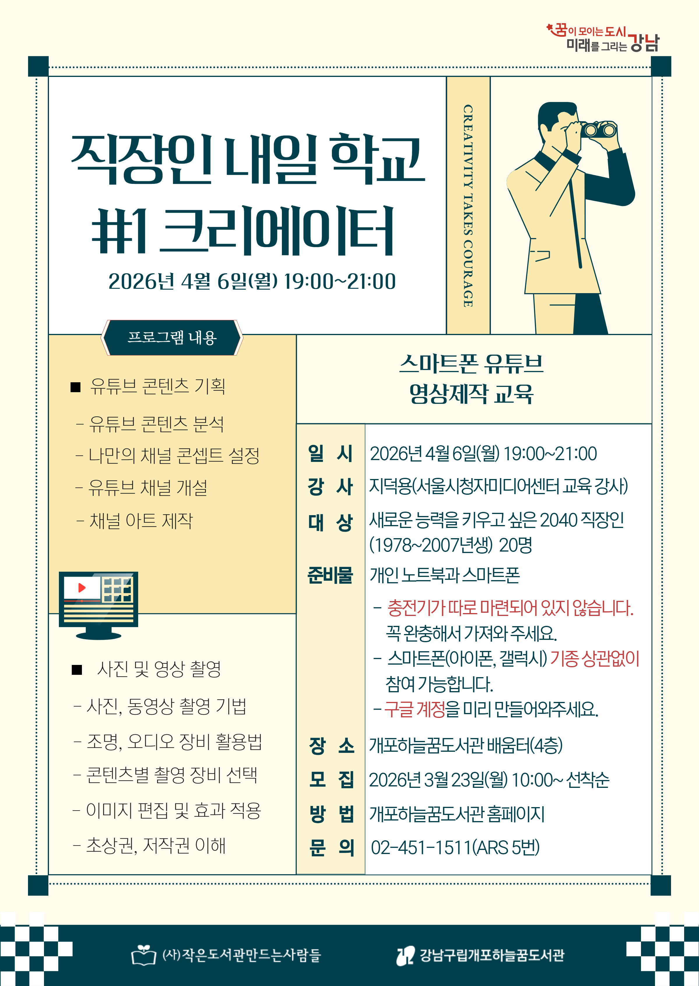 <직장인 내일 학교>는 회사 안과 밖 어느 곳에서나 활용할 수 있는 능력을 개발하기 위한 프로그램입니다. 회사 내부에서 추가적인 업무를 위해 배울 수도 있고, N잡 혹은 취미 생활을 목적으로 들을 수도 있습니다. 이번 첫 시간에는 '크리에이터'를 주제로 진행됩니다. - 유튜브 콘텐츠 기획 : 콘텐츠 분석, 채널 콘셉트 설정, 영상제작 앱 추천 등 - 유튜브 채널 디자인 : 채널 개설(★개인 구글 계정 필요★), 이미지 툴을 활용한 채널 아트 제작 등 - 사진 / 영상 촬영 및 편집 : 구도 이해, 촬영 기법, 조명 및 오디오 장비 활용법, 콘텐츠별 촬영 장비 선택, 편집 방법, 초상권과 저작권 이해 새로운 능력을 키우고 싶은 직장인 분들을 환영합니다! ★2040 대상 프로그램으로 1978~2007년생 성인만 참여 가능합니다 ★노트북과 스마트폰을 활용하는 프로그램으로 완전히 충전해서 가져와 주세요 (도서관에 따로 충전기가 마련되어 있지 않습니다. 방전될 시 참여가 어려울 수 있습니다.) ★유튜브 채널 개설을 위해 구글 계정이 필요합니다. 구글 계정이 없으신 분은 만들어 주세요. (아이디랑 비밀번호가 기억 안 날 상황을 대비해 메모해서 가져오시면 좋습니다.) ![]() ![]() ○일시 : 2026. 4. 6.(월요일) 19:00~21:00 ○대상 : 새로운 능력을 키우고 싶은 2040 직장인 (1978~2007년생) 20명 ○장소 : 하늘꿈도서관 4층 배움터 ○접수 : 2026년 3월 23일(월) 오전 10시 ~ (선착순) ○신청방법 : 하늘꿈도서관 홈페이지 ○문의 : 02-451-1511 / ARS 5번 ※프로그램 신청시 참여자 본인의 아이디로 신청 하셔야 합니다. ※프로그램 신청 시 홍보용 사진 촬영 및 사용에 동의하시는 것으로 간주됩니다. ※프로그램 관련 공지사항은 문자로 발송되오니 회원가입 시 입력된 휴대폰번호 확인 부탁드립니다. |