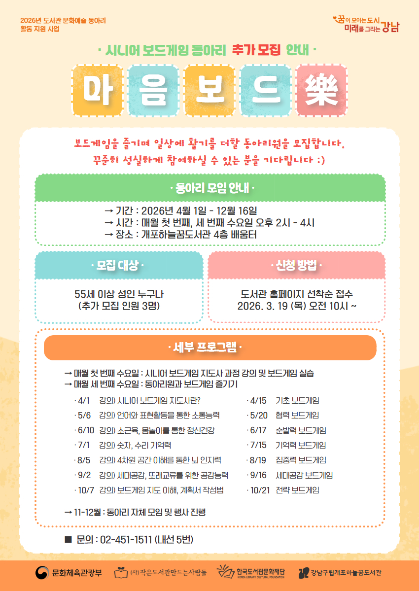 <마음보드락(樂)>은 보드게임이라는 매개체를 통해 정기적으로 만나 소통하고 협력하며, 긍정적인 정서를 나누는 시니어 보드게임 동아리입니다. 새롭고 즐거운 여가 문화를 경험하실 분들의 관심을 바랍니다. ★ <마음보드락(樂)>은 55세 이상 성인(1972년 이전 출생)에 한해 참여할 수 있습니다. ★ 동아리 모임은 매월 첫 번째, 세 번째 수요일 오후 2시~4시, 개포하늘꿈도서관 4층 배움터에서 진행됩니다. ★ 매월 꾸준히 참여하실 분들의 참여를 기다립니다. ※ 4월~10월은 보드게임 전문 강사와 함께 폭넓고 깊이 있게 보드게임을 배우고, 즐기는 시간을 갖습니다. → 매월 첫 번째 수요일 : 시니어 보드게임 지도사 과정 강의 및 보드게임 실습 → 매월 세 번째 수요일 : 동아리원과 보드게임 즐기기 ※ 11월~12월에는 동아리 자체 모임 및 행사 진행이 예정되어 있습니다. ※ 일정 출석률 이상 달성 시 수료증이 발급되며, 원하시는 경우 시니어 보드게임 지도사 자격증(별도 비용)을 발급받을 수 있습니다. ![]() ![]() ※ 동아리 신청시 참여자 본인의 아이디로 신청하셔야 합니다. ※ 동아리 신청시 홍보용 사진 촬영 및 사용에 동의하시는 것으로 간주합니다. ※ 동아리 관련 공지사항은 문자 또는 카카오톡으로 발송됩니다. 회원가입 시 입력된 휴대전화번호를 확인해주세요. ○ 운영 기간 : 2026. 4. 1. ~ 12. 16. (매월 첫 번째, 세 번째 수요일) 14:00~16:00 ○ 장소 : 개포하늘꿈도서관 4층 배움터 ○ 대상 : 55세 이상 성인 3명 (추가 모집) ○ 신청 방법 : 개포하늘꿈도서관 홈페이지 신청 ○ 문의 : 02-451-1511 |
