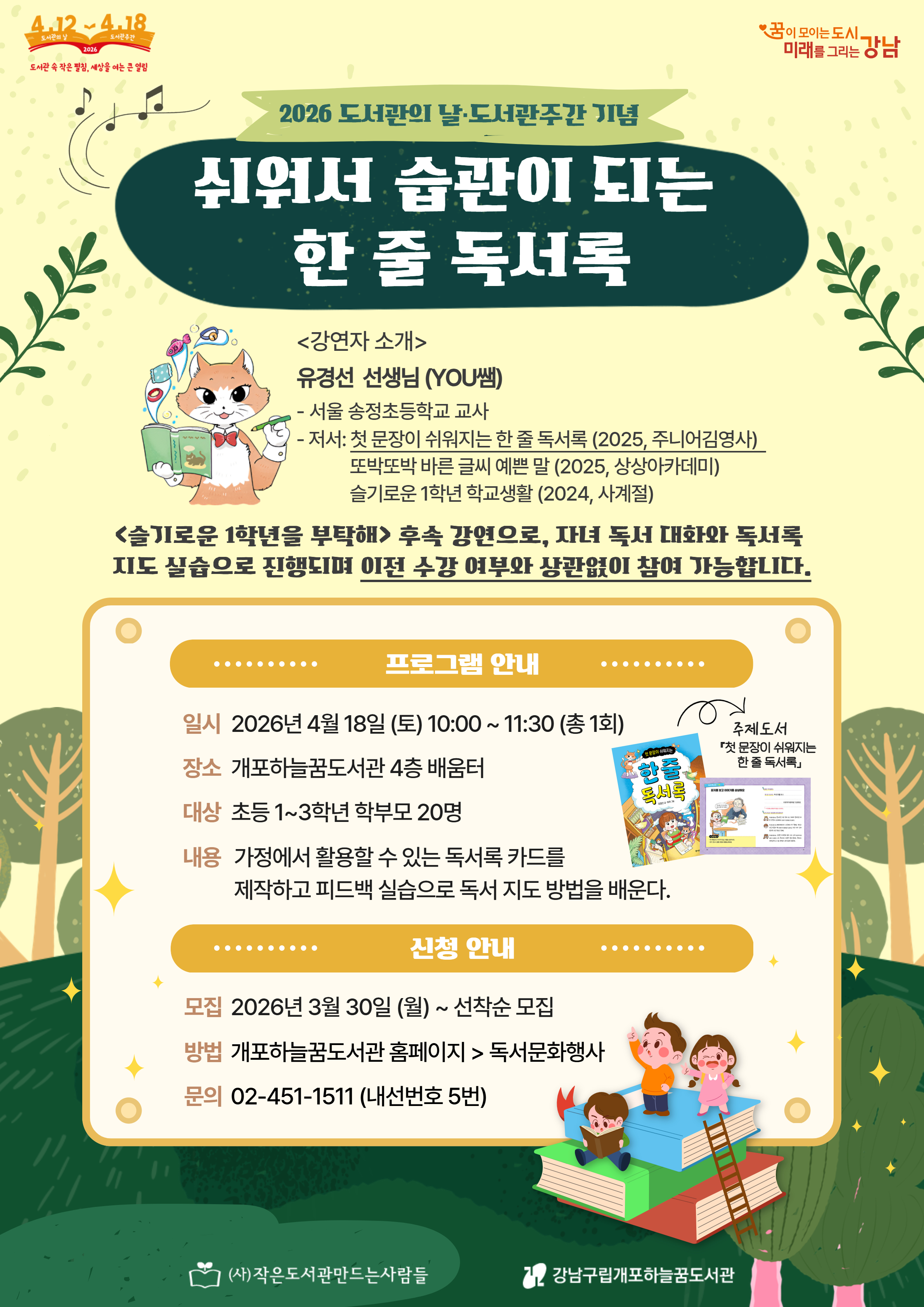 우리 아이 어떻게 독서록 지도해야 할지 고민이라면? 책『첫 문장이 쉬워지는 한 줄 독서록』저자인 유경선 선생님과 함께하는 초등 양육자를 위한 독서록 작성 가이드 🎒🤓🏫 이번 강연에 다룰 내용 ✅ 독서 환경 탐색하고, 경험 나누기: 독서 습관 체크리스트 ✅ 독서록의 이해: 독서와 기록의 중요성, 독서록에 관한 Q&A ✅ 독서록 빌드업(오늘 책-한 줄 감상 대화-한 줄 독서록) ✅ 한 줄 독서록의 확장: 한 문단 독서록 쓰기 등 ★신청 완료 후 2~3일 이내에 참여자를 대상으로 온라인 폼을 통해 사전 질문을 받을 예정입니다.★ 원활한 안내를 위해 신청 시 연락 가능한 연락처를 정확히 기재해 주시기 바랍니다. 접수된 사전 질문은 강연 당일 질의응답 시간에 활용될 예정입니다. ![]() ![]() ○일시 : 2026. 4. 18. (토요일) 10:00~11:30 ○대상 : 성인 20명 (초등 1~3학년 양육자) ○장소 : 하늘꿈도서관 4층 배움터 ○접수 : 2026년 3월 30일(월) 오전 10시 ~ (선착순) ○신청방법 : 하늘꿈도서관 홈페이지 ○문의 : 02-451-1511 / ARS 5번 ※프로그램 신청시 참여자 본인의 아이디로 신청 하셔야 합니다. ※프로그램 신청 시 홍보용 사진 촬영 및 사용에 동의하시는 것으로 간주됩니다. ※프로그램 관련 공지사항은 문자로 발송되오니 회원가입 시 입력된 휴대폰번호 확인 부탁드립니다. |