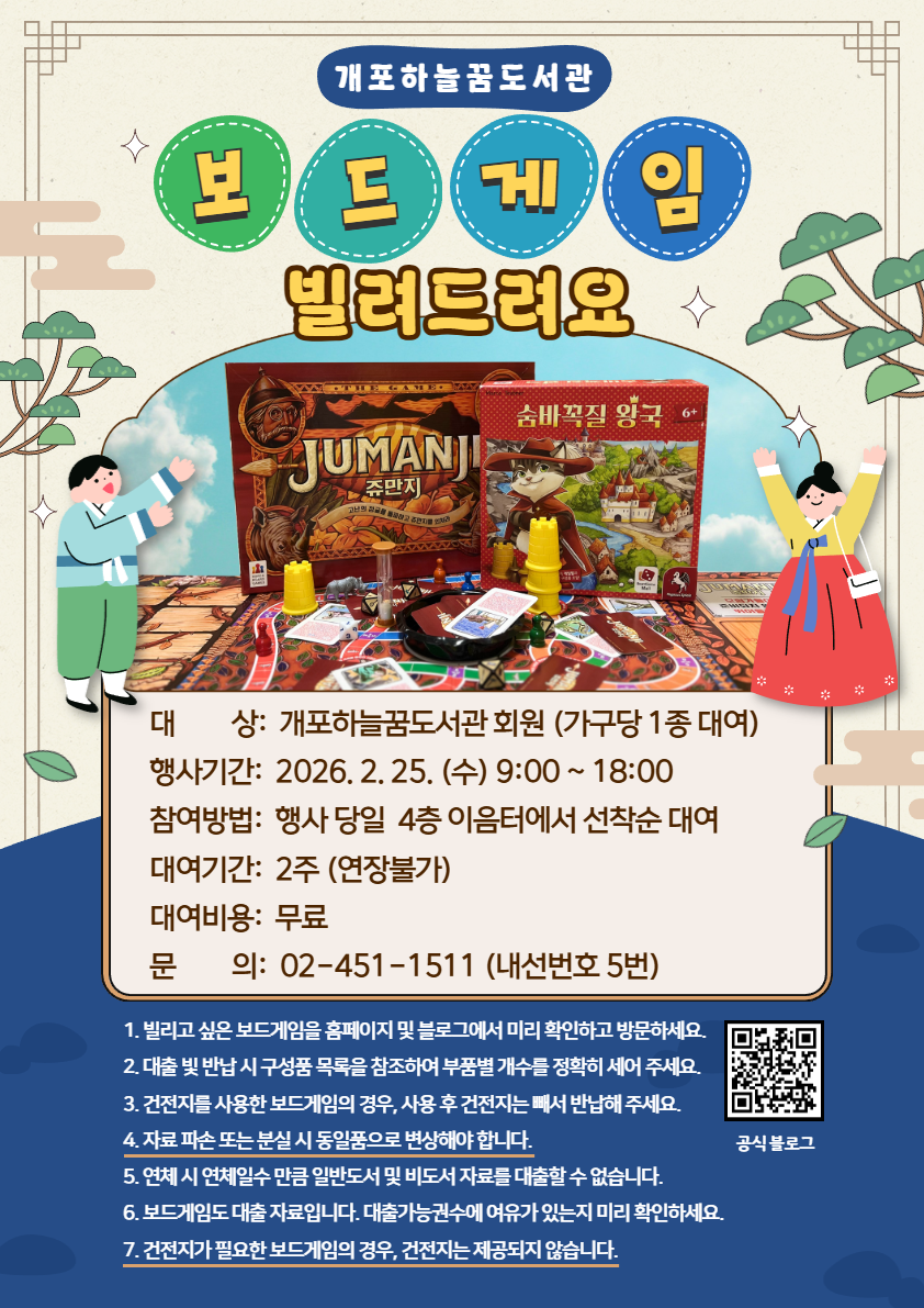 ![]() [개포하늘꿈도서관 문화의 날 이벤트] 보드게임 빌려드려요 : 도서관에서 빌린 보드게임, 집에서 즐기자! 1. 대상: 개포하늘꿈도서관 정회원(가구당 1종 대여) 2. 행사기간: 2026년 2월 25일(수) 09:00 ~ 18:00 3. 참여방법: 행사 당일 4층 이음터에서 선착순 수령 4. 대여기간: 2주(연장불가) 5. 대여비용: 무료 6. 반납방법: 반드시 1층 및 2층 데스크에 반납 7. 문의: 02-451-1511(내선번호 6번) ※ 유의사항 1. 빌리고 싶은 보드게임을 홈페이지 및 블로그에서 미리 확인하고 방문하세요. 2. 대출 및 반납 시 구성품 목록을 참조하여 부품별 개수를 정확히 세어 주세요. 3. 건전지를 사용한 보드게임의 경우, 사용 후 건전지는 빼서 반납해 주세요. 4. 자료 파손 또는 분실 시 동일품으로 변상해야 합니다. 5. 연체 시 연체일수 만큼 일반도서 및 비도서 자료를 대출할 수 없습니다. 6. 보드게임도 대출 자료입니다. 대출가능권수에 여유가 있는지 미리 확인하세요. 7. 건전지가 필요한 보드게임의 경우, 건전지는 제공되지 않습니다. 전체 게임 목록은 도서관 홈페이지 및 공식 블로그에서 확인 가능합니다. 도서관 홈페이지 검색창에 "보드게임"으로 검색하세요. 블로그(메뉴명: "보드게임 빌려드려요")에는 상세한 게임방법이 그림과 함께 안내되어 있습니다. -홈페이지: https://library.gangnam.go.kr/hnkklib -블로그: https://blog.naver.com/PostList.naver?blogId=skydreamlib&from=postList&categoryNo=1 |