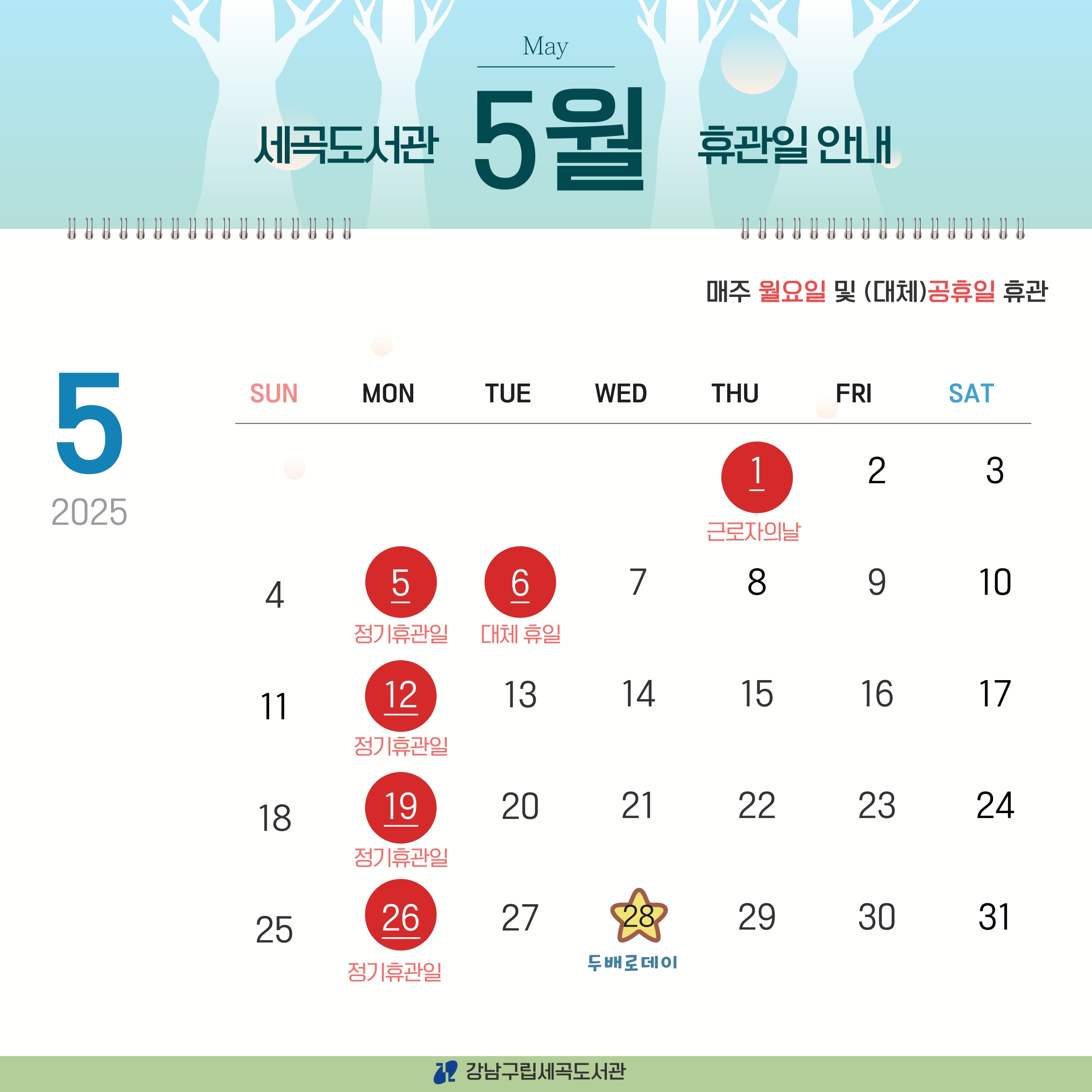 [세곡도서관] 2025년 5월 휴관일 안내