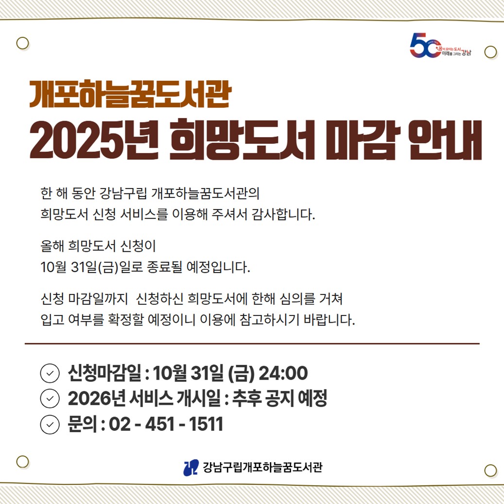 [2025년 개포하늘꿈도서관 희망도서 신청 마감 안내] 한 해 동안 강남구립개포하늘꿈도서관의 희망도서 서비스를 이용해주셔서 감사합니다. 도서납품 계약만료 일정에 따라, 2025년 희망도서 신청 마감일을 안내드립니다. 신청 마감일까지 신청하신 희망도서에 한해 심의를 거쳐 입고 여부를 확정할 예정이니 도서관 이용에 참고하시기 바랍니다. ▶ 신청 마감일: 10월 31일(금) 24:00 ▶ 2026년 서비스 개시일: 추후 공지 예정 ▶ 문의: 02-451-1511 ![]() |
