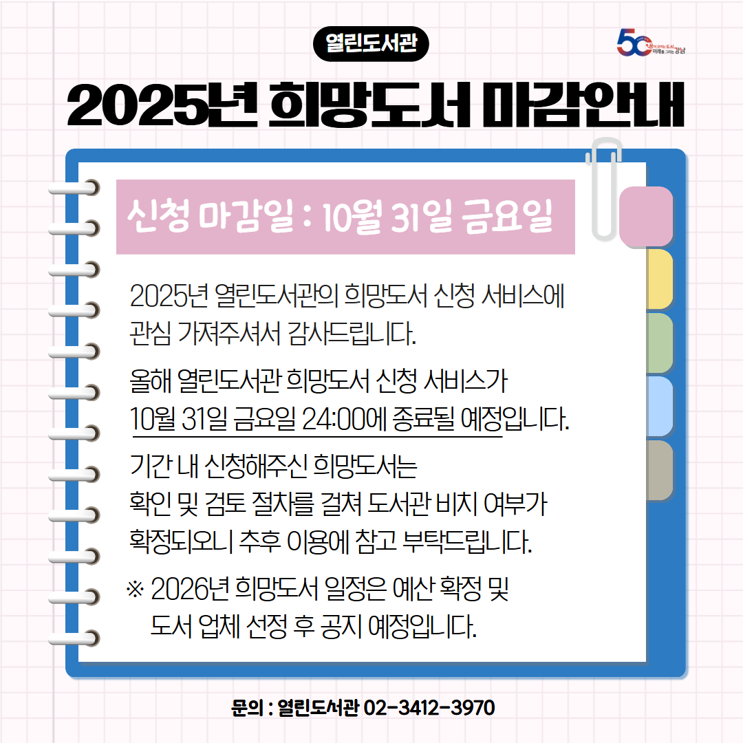 2025년 한 해 동안 열린도서관의 희망도서 서비스를 이용해주셔서 감사드립니다. 도서납품 계약만료 일정에 따른 2025년 희망도서 신청 마감일을 안내드립니다. 희망도서 신청 마감일 : 2025년 10월 31일 금요일 24:00 기간 내 신청해주신 희망도서는 확인 및 검토 절차를 걸쳐 도서관 비치 여부를 확정하오니 추후 이용에 참고 부탁드립니다. * 2026년 희망도서 일정은 예산 확정 및 도서 업체 선정 후 공지 예정입니다. ![]() |