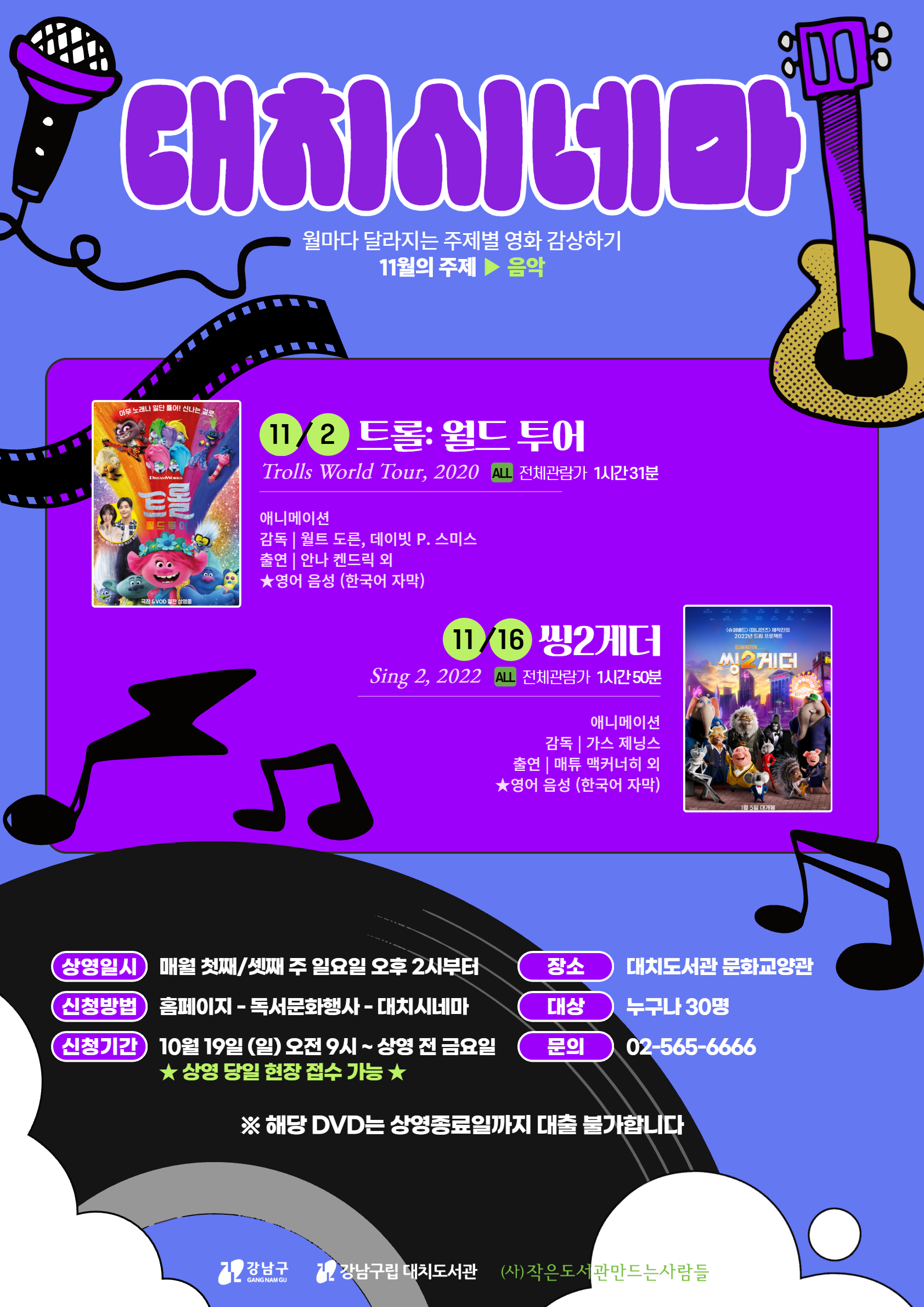 월마다 달라지는 주제별 영화를 감상하는 시간! 11월 첫째, 셋째 주 일요일 오후 2시에 "대치도서관 문화교양관"에서 만나보실 수 있습니다 :) 11월의 주제는 "음악"입니다. 대치시네마에서 몸이 들썩이는 음악과 무대를 향한 모험을 즐겨보세요! 일시 : 11/2, 11/16 (일) 오후 2시~4시 장소 : 대치도서관 문화교양관 대상 : 도서관 이용자 누구나 신청 방법 : 홈페이지 독서문화행사>대치시네마>2025년 11월>신청하기 신청 시간 : 10/19 (일) 오전 9시 ~ 상영 전 금요일 오후 2시 ★상영 당일 현장 접수 가능합니다★ 신청 바로가기 ![]() |