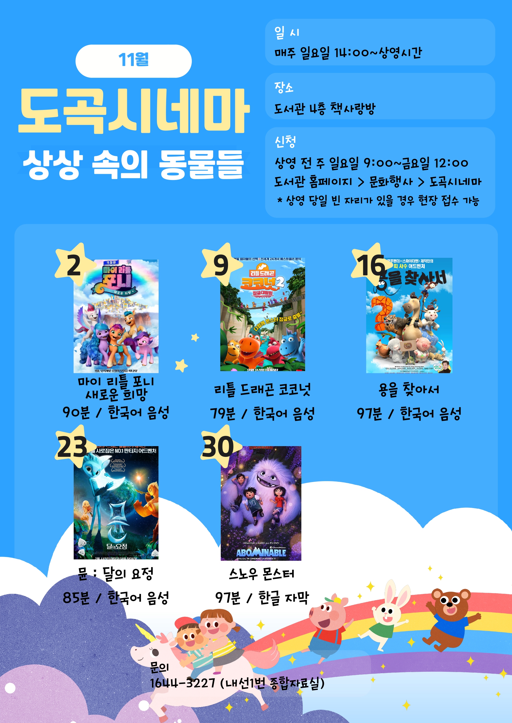 11월 도곡시네마 주제는 <상상 속의 동물들> 입니다~ 책에서, 꿈에서 만났던 신비로운 동물들을 영화 속에서 생생하게 만나봐요 - 일시: 매주 일요일 14:00~상영시간 - 장소: 4층 책사랑방 - 신청: 매주 일요일 9:00~금요일 12:00 도서관 홈페이지>문화행사>도곡시네마 ※상영 당일 빈 자리가 있는 경우 현장 접수 가능 - 문의: 1644-3227, 내선 1번 종합자료실 - 11월 도곡시네마 신청하러 가기 (클릭하시면 신청 페이지로 이동합니다) - 상영작 🦄 11/2 <마이 리틀 포니 : 또다른 희망> 90분, 한국어음성 🐲 11/9 <리틀 드래곤 코코넛2 : 정글대탐험> 79분, 한국어음성 🦄 11/16 <용을 찾아서> 97분, 한국어음성 🐲 11/23 <뮨: 달의 요정> 85분, 한국어 음성 🦄 11/30 <스노우 몬스터> 97분, 한글자막
