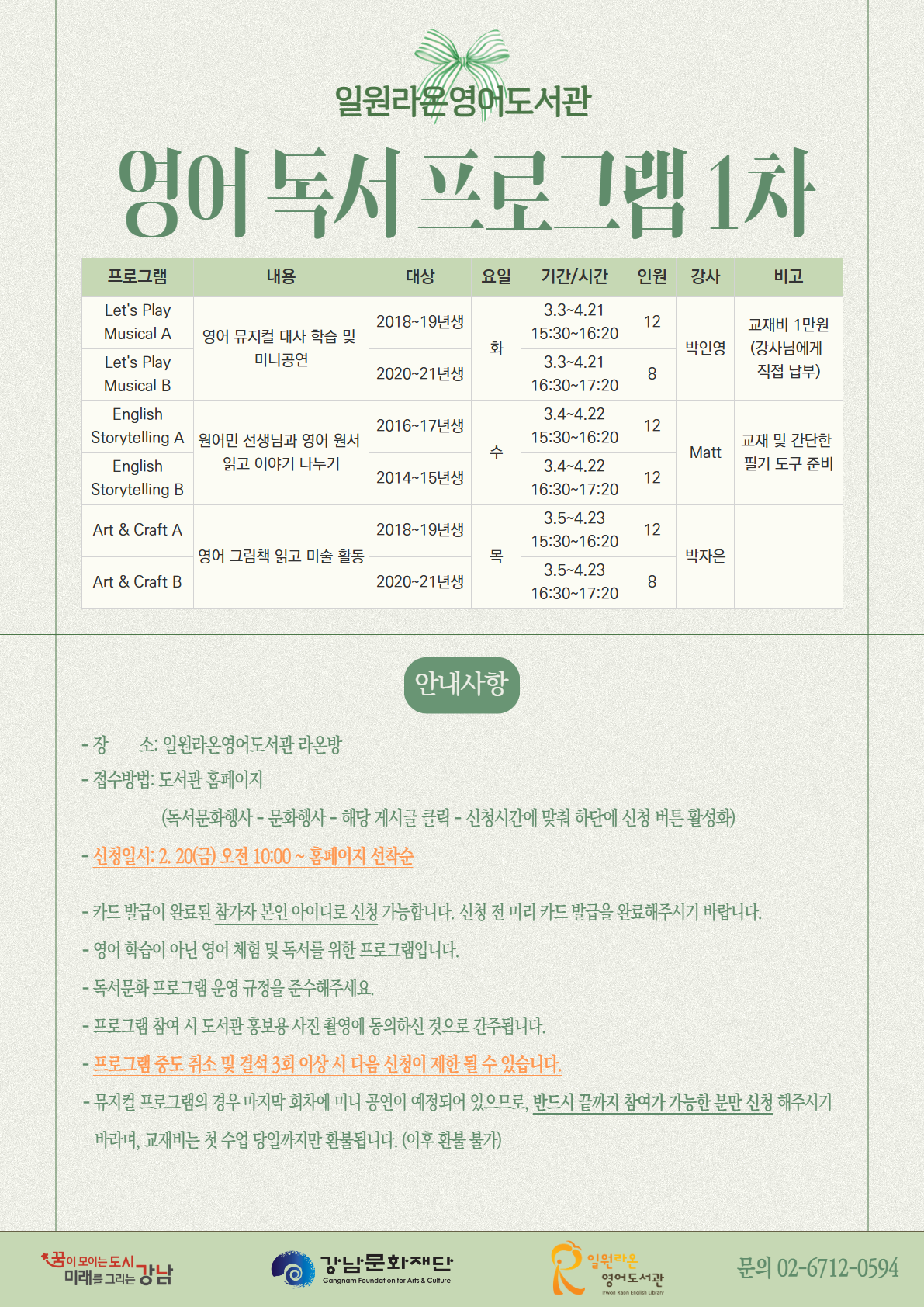 2026년 일원라온영어도서관 1차 영어 독서 프로그램 모집 안내
