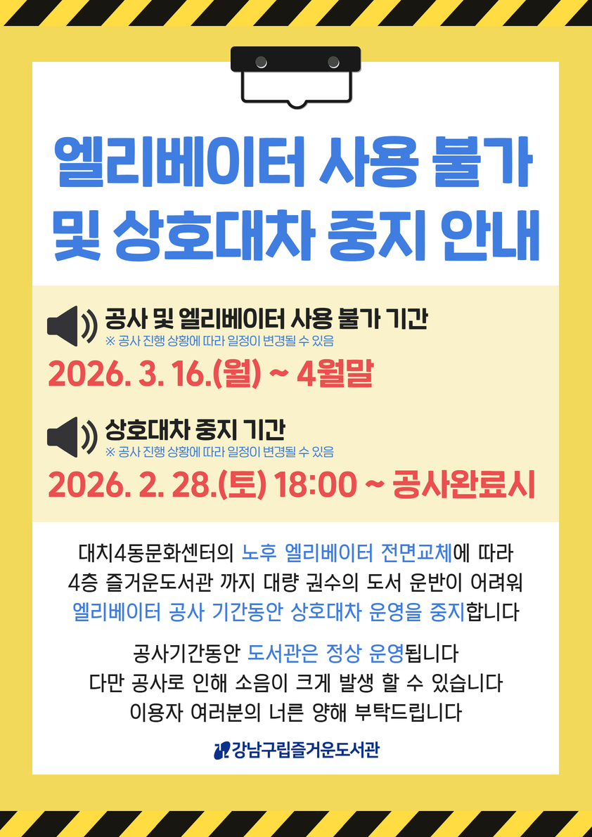 [※추가공지※] 즐거운도서관 엘리베이터 사용불가 및 상호대차 중지 안내
