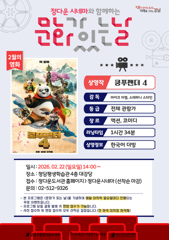 정다운시네마 2월의 영화 쿵푸팬더 4 * 도서관 사정에 따라 상영작은 변경될 수 있습니다. ⏰ 일시 : 2026. 02. 22. (일요일) 14:00~ (*상영작 러닝타임에 따라 시간 변동이 있을 수 있습니다.) 📮 장소 : 청담평생학습관 4층 대강당 😽 대상 : 누구나 💻 접수 : 정다운도서관 홈페이지>정다운시네마 🎤 문의 : 02-512-9326(정다운도서관) 마침내 내면의 평화… 냉면의 평화…가 찾아왔다고 믿는 용의 전사 ‘포’ 이젠 평화의 계곡의 영적 지도자가 되고, 자신을 대신할 후계자를 찾아야만 한다. “이제 용의 전사는 그만둬야 해요?” 용의 전사로의 모습이 익숙해지고 새로운 성장을 하기보다 지금 이대로가 좋은 ‘포’ 하지만 모든 쿵푸 마스터들의 능력을 그대로 복제하는 강력한 빌런 ‘카멜레온’이 나타나고 그녀를 막기 위해 정체를 알 수 없는 쿵푸 고수 ‘젠’과 함께 모험을 떠나게 되는데… 포는 가장 강력한 빌런과 자기 자신마저 뛰어넘고 진정한 변화를 할 수 있을까? 🎬 신청 바로가기