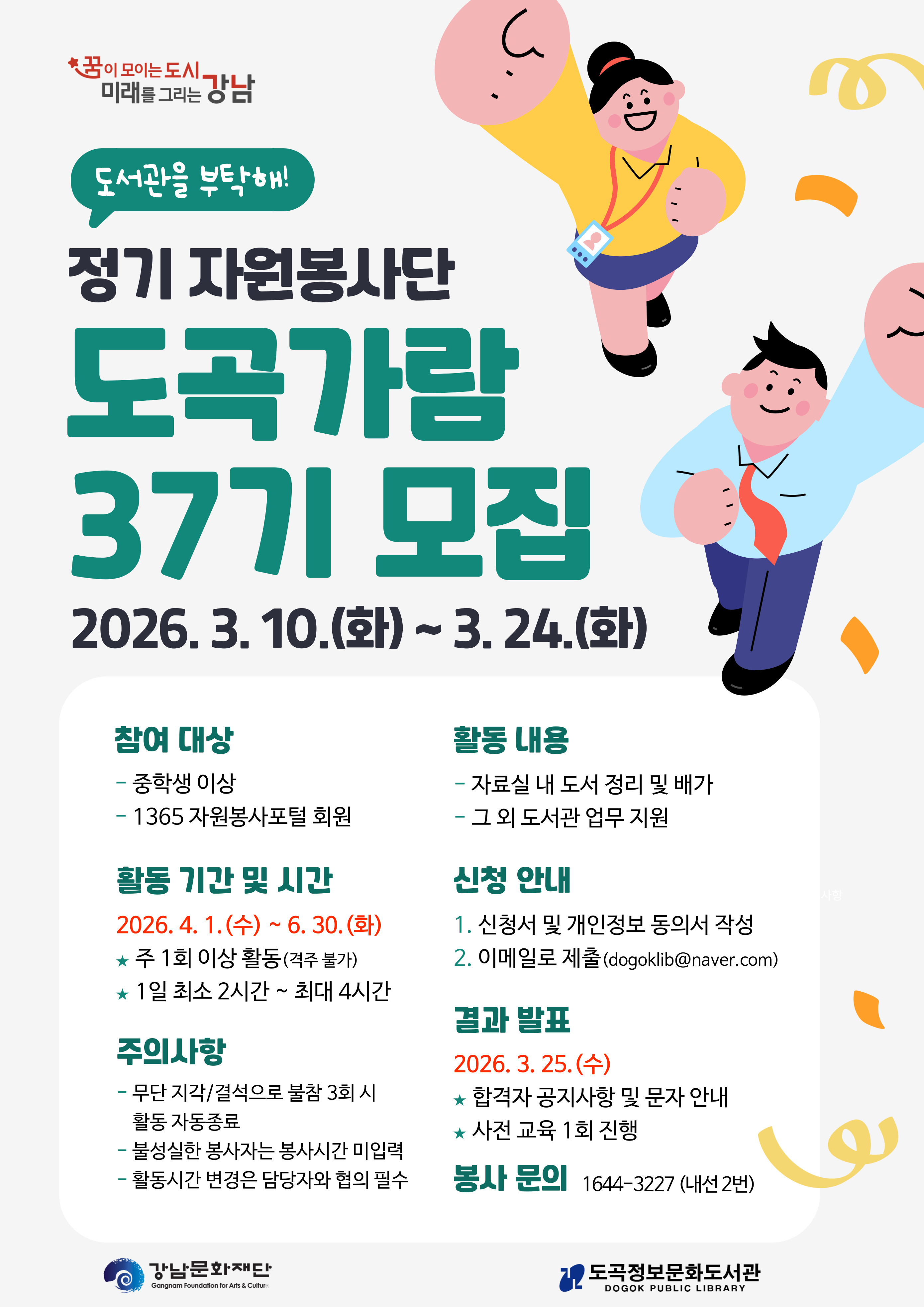 2026년 2분기 도곡정보문화도서관 정기 자원봉사단 <도곡가람 37기>를 모집합니다! 주 활동 내용은 자료실 내 도서 정리 및 배가 입니다. 첨부파일을 다운받아 신청서 및 개인정보 동의서 작성(서명 필수) 후 도서관 이메일(dogoklib@naver.com)로 보내주세요. 자세한 내용은 포스터를 확인해 주세요. 많은 참여 부탁드립니다! 봉사 문의 : 1644-3227(내선 2번 어린이자료실)