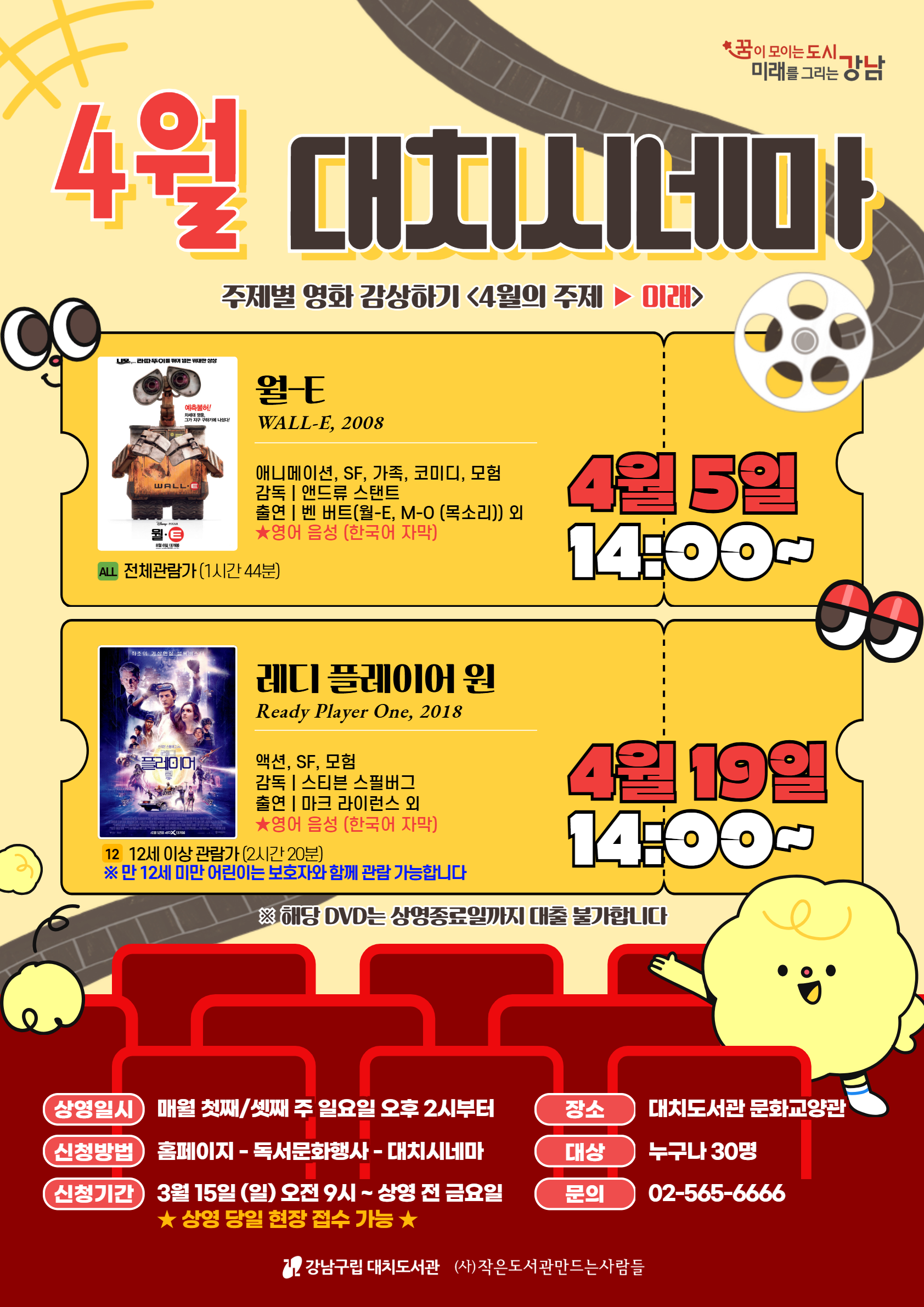 월마다 달라지는 주제별 영화를 감상하는 시간! 4월 첫째, 셋째 주 일요일 오후 2시에 "대치도서관 문화교양관"에서 만나보실 수 있습니다 :) 4월의 주제는 "미래"입니다. 대치시네마와 함께 다가올 미래 사회를 꿈꿔보세요! 일시 : 4/5, 4/19 (일) 오후 2시~4시 장소 : 대치도서관 문화교양관 대상 : 도서관 이용자 누구나 ※ 만 12세 미만 어린이의 경우 <레디 플레이어 원>은 보호자와 함께 관람 가능합니다. 신청 방법 : 홈페이지 독서문화행사>대치시네마>2026년 4월>신청하기 신청 시간 : 3/15(일) 오전 9시 ~ 상영 전 금요일 오후 2시 ★상영 당일 현장 접수 가능합니다★ 신청 바로가기