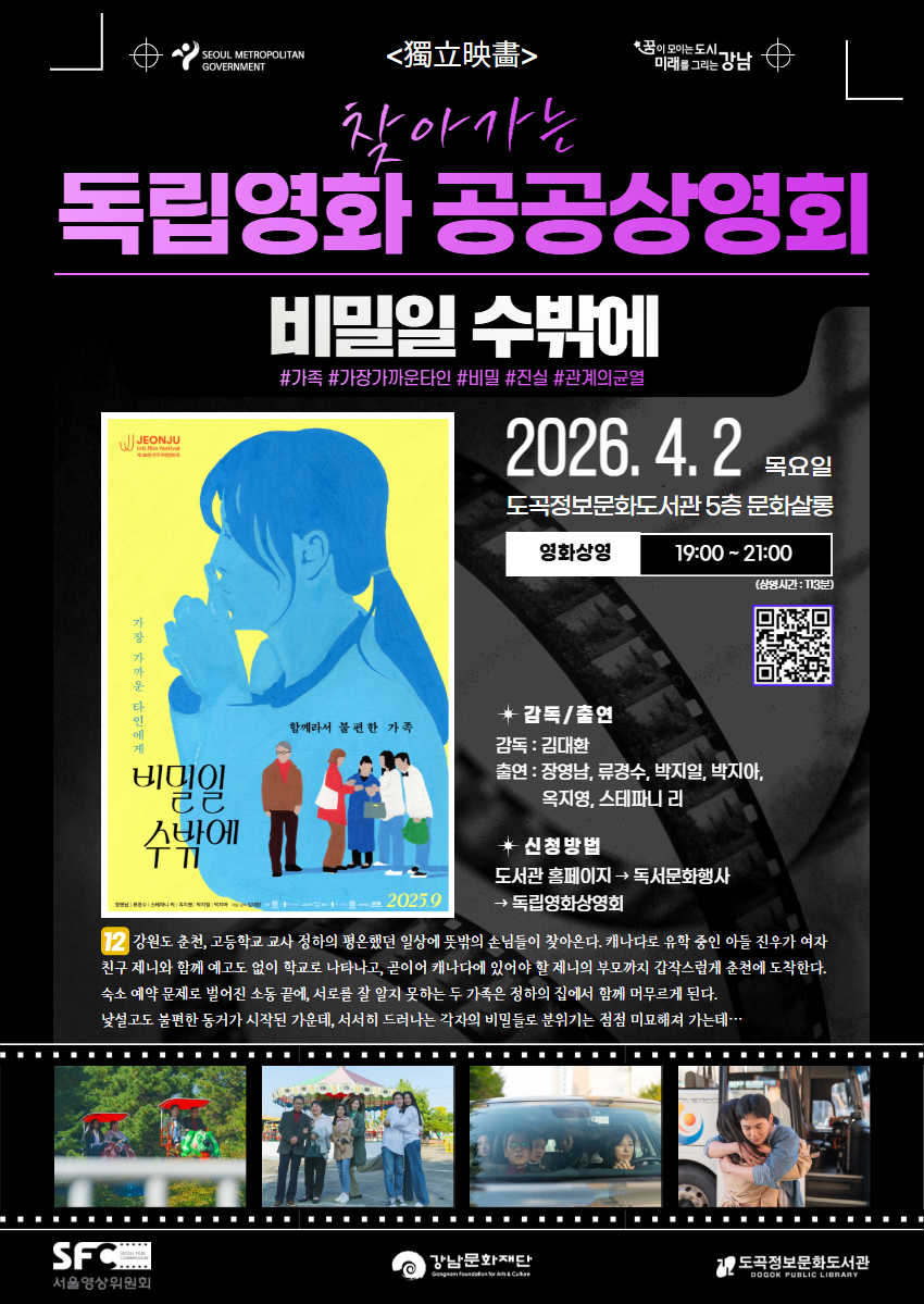 찾아가는 독립영화 공공상영회 4월 1차 상영작 안내🎥 🎠 4월 첫번째 상영작 : <비밀일 수밖에> 💐상영일시 : 4월 2일 (목) 19:00~21:00 🏠장소 : 5층 문화살롱 🎬접수 바로가기 강원도 춘천, 고등학교 교사 정하의 평온했던 일상에 뜻밖의 손님들이 찾아온다. 캐나다로 유학 중인 아들 진우가 여자친구 제니와 함께 예고도 없이 학교로 나타나고, 곧이어 캐나다에 있어야 할 제니의 부모까지 갑작스럽게 춘천에 도착한다. 숙소 예약 문제로 벌어진 소동 끝에, 서로를 잘 알지 못하는 두 가족은 정하의 집에서 함께 머무르게 된다. 낯설고도 불편한 동거가 시작된 가운데, 서서히 드러나는 각자의 비밀들로 분위기는 점점 미묘해져 가는데… ![]() |
