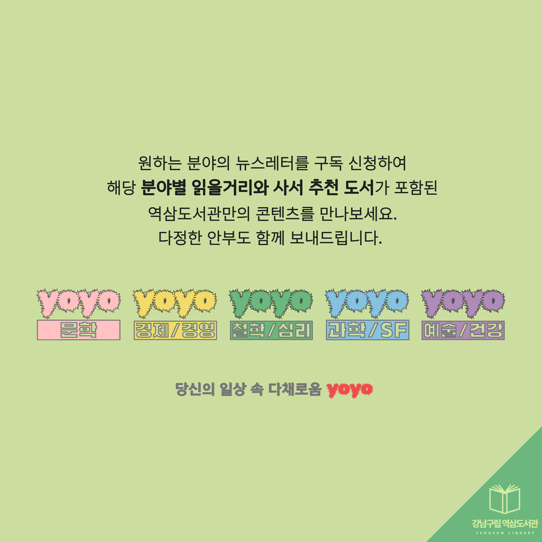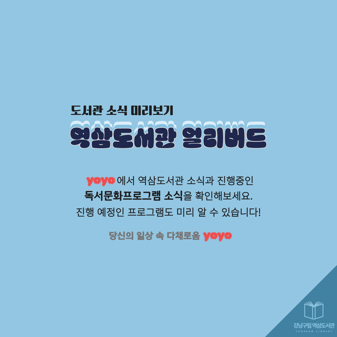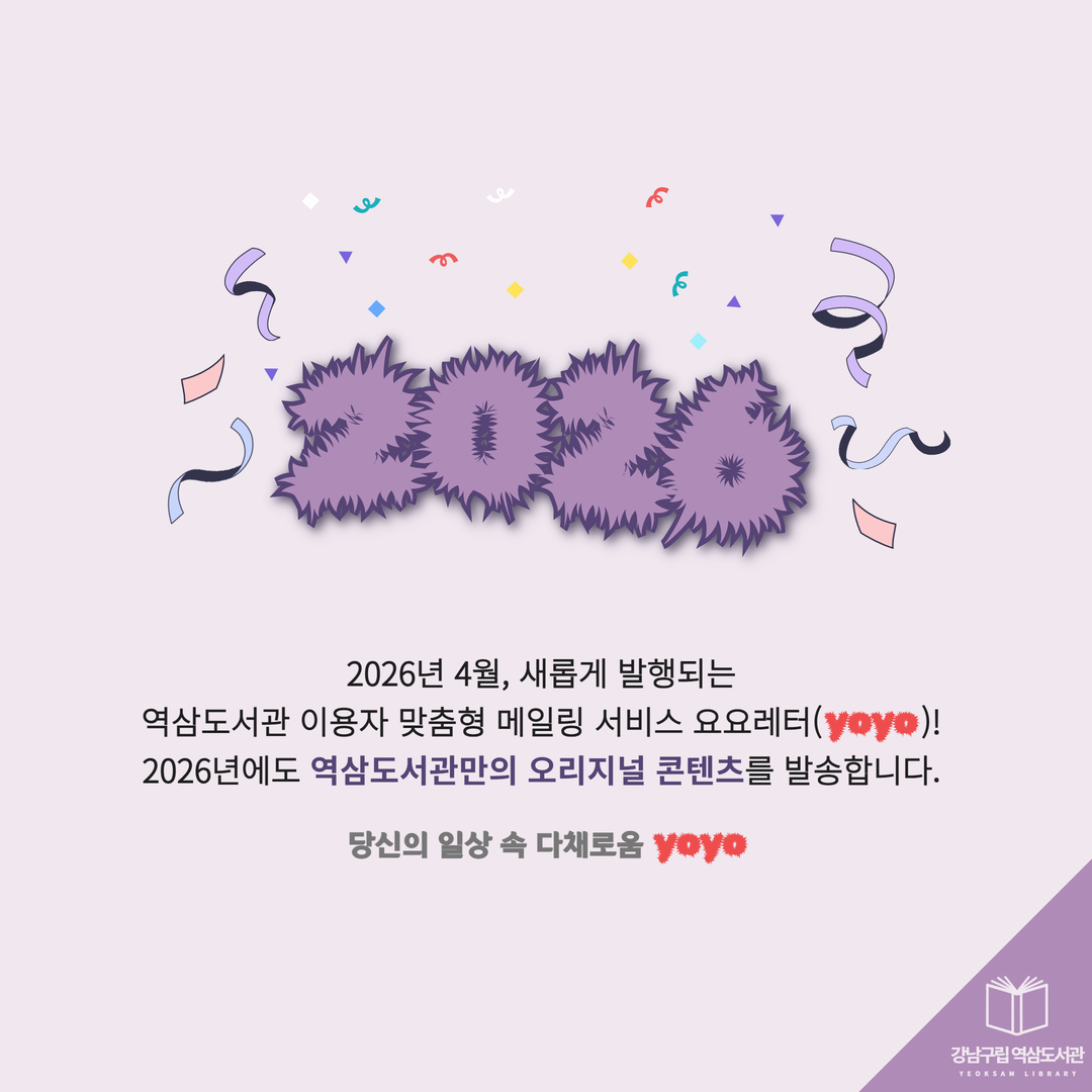 2026년 4월, 새롭게 발행되는 역삼도서관 이용자 맞춤형 메일링 서비스 요요레터(yoyo)! 올해에도 많은 관심 부탁드립니다. 2026년 첫 발송은 4월 20일(월)~24일(금) 예정입니다. 요요레터(yoyo) 과월호 업로드 게시판 https://library.gangnam.go.kr/yslib/menu/12597/bbs/20418/bbsPostList.do ![]() ![]() ![]() ![]() ![]() ![]() ![]() ![]() |