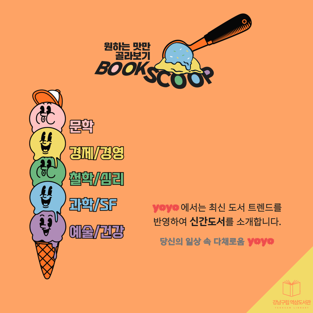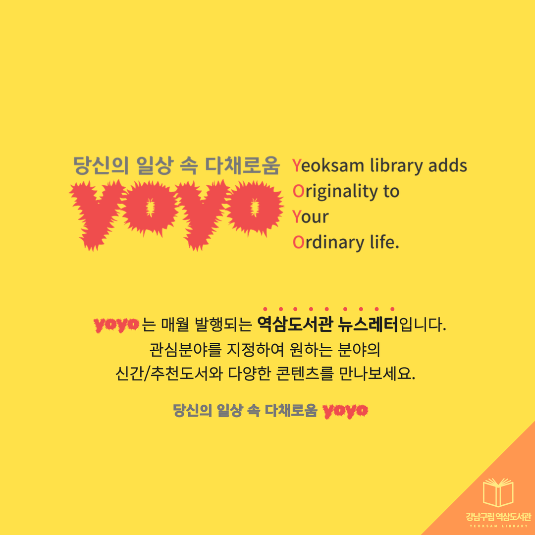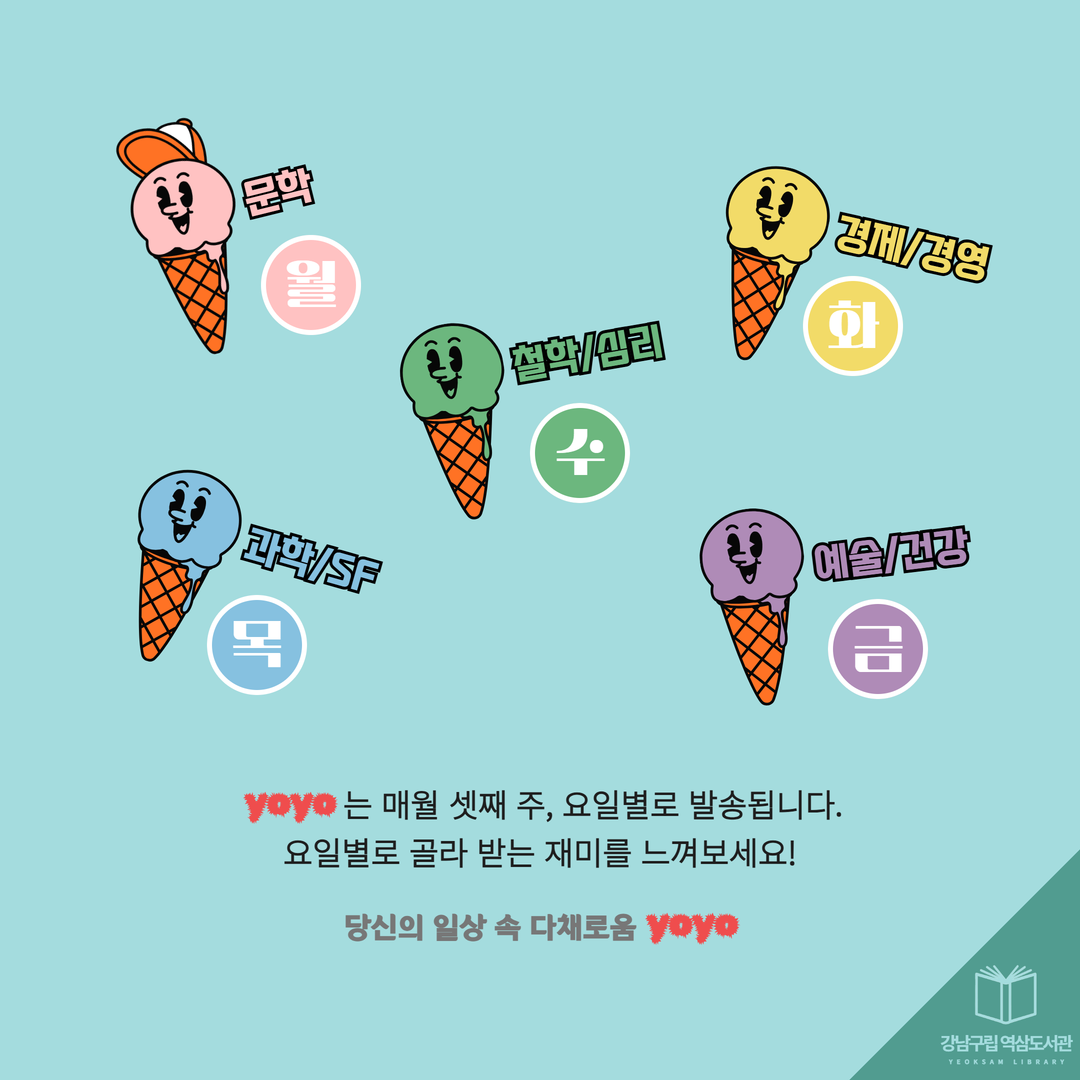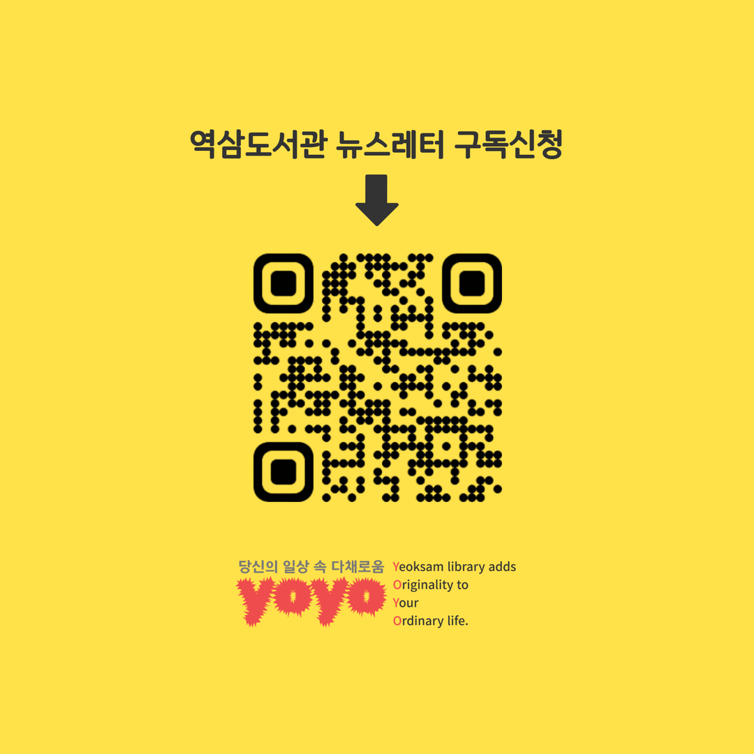 2026년 4월, 새롭게 발행되는 역삼도서관 이용자 맞춤형 메일링 서비스 요요레터(yoyo)! 올해에도 많은 관심 부탁드립니다. 2026년 첫 발송은 4월 20일(월)~24일(금) 예정입니다. 요요레터(yoyo) 과월호 업로드 게시판 https://library.gangnam.go.kr/yslib/menu/12597/bbs/20418/bbsPostList.do ![]() ![]() ![]() ![]() ![]() ![]() ![]() ![]() |