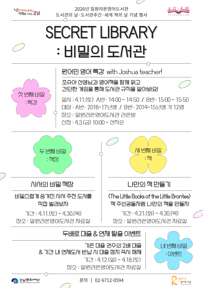 | 제목 | 2026년 일원라온영어도서관 도서관의 날·도서관주간·세계 책의 날 기념 행사 안내 |