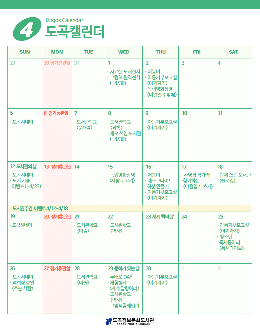 📗4월 도곡캘린더입니다!📗 4월 주요행사로는 도서관의 날·도서관주간 및 세계 책의 날 행사 <함께 쓰는 도서관> 상반기 책으로 성장하는 도서관학교 찾아가는 독립영화 공공상영회 아동기 부모교실 <아기자기> 등이 준비되어 있습니다. 모두 많은 관심 바랍니다. 감사합니다. ※ 5층 문화살롱 단축운영일을 참고하시어 이용해 주시기 바랍니다. ![]()