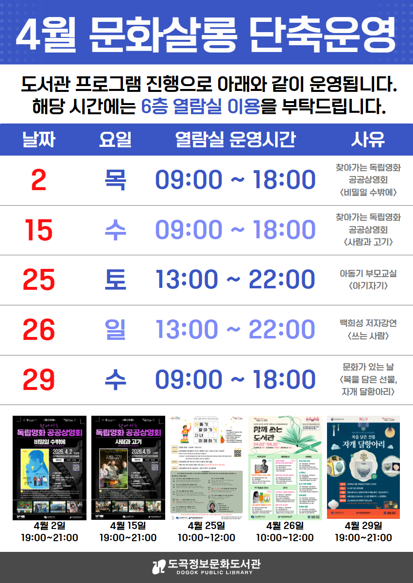 | 제목 | 4월 도곡캘린더 및 문화살롱(1열람실) 단축운영 안내 |