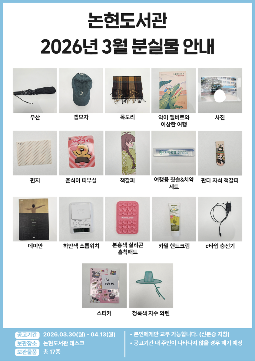 논현도서관 2026년 3월 분실물 안내드립니다.