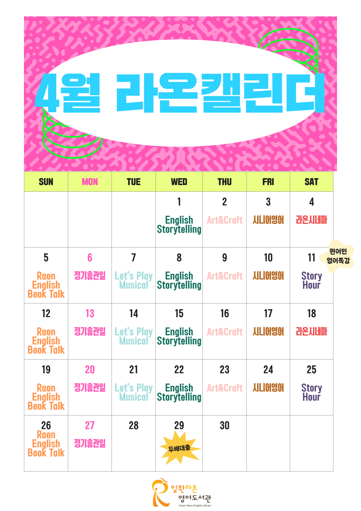 일원라온영어도서관 4월 라온캘린더 입니다.