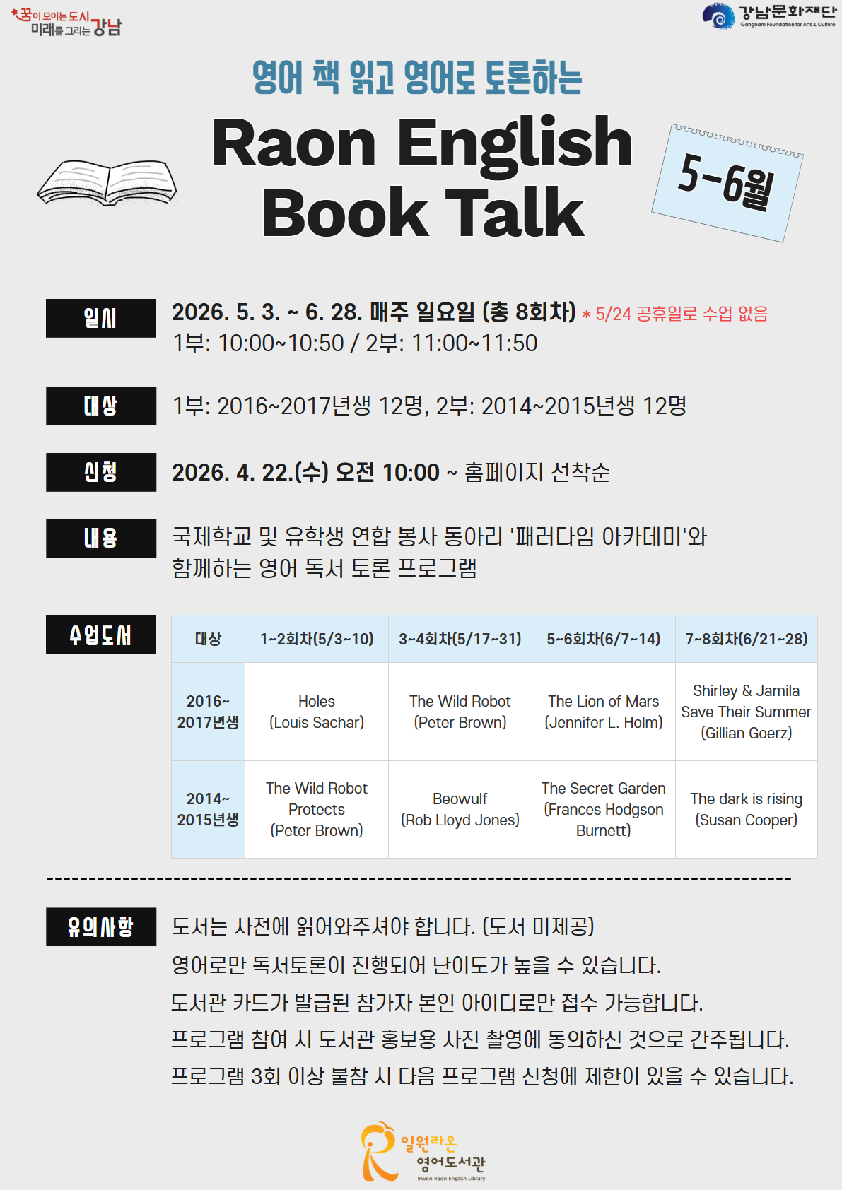 | 제목 | 2026년도 5-6월 RAON ENGLISH BOOK TALK 프로그램 모집 안내 |