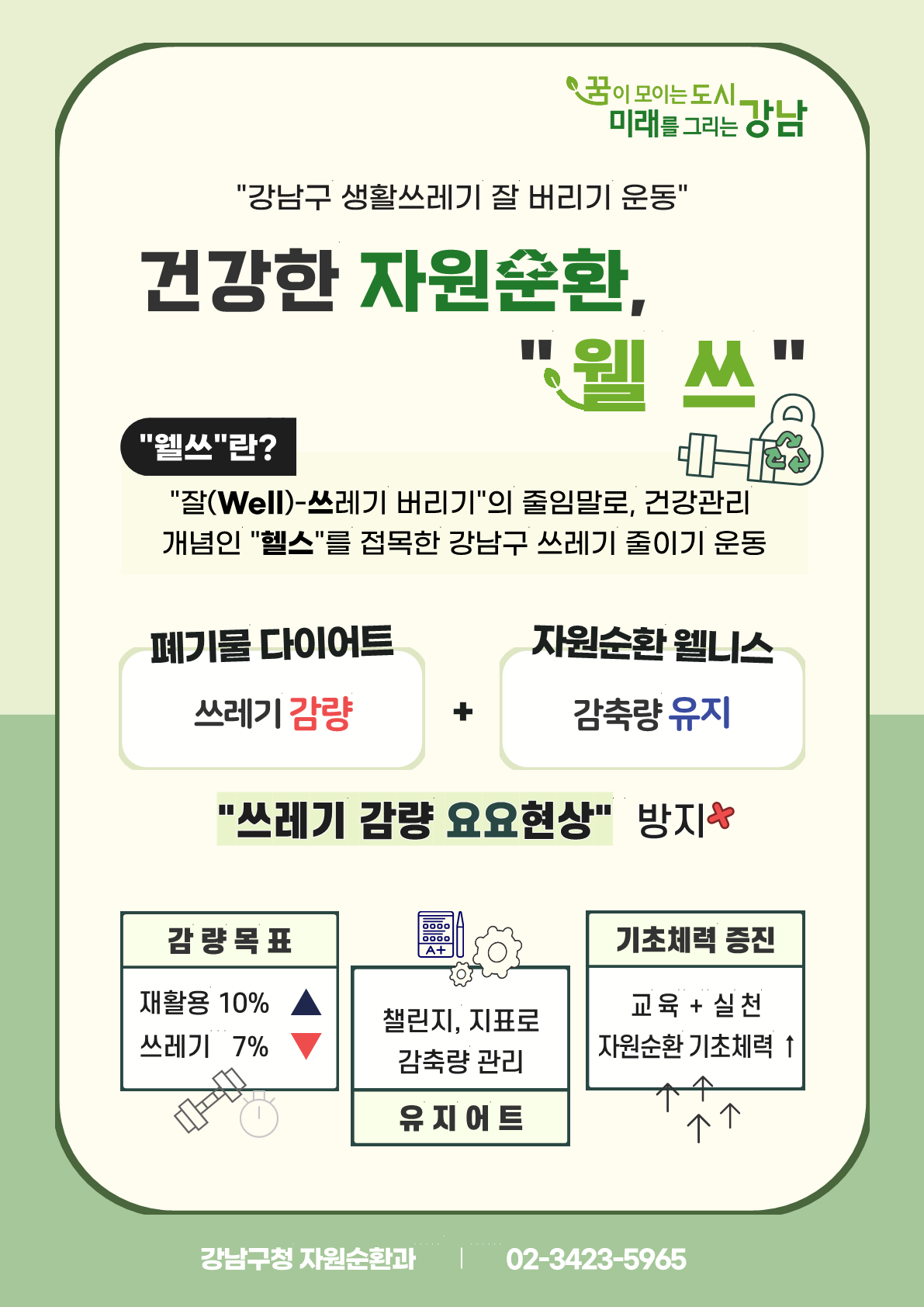 | 제목 | [강남구 생활쓰레기 잘 버리기 운동] 건강한 자원순환, '웰쓰' 캠페인 안내 |