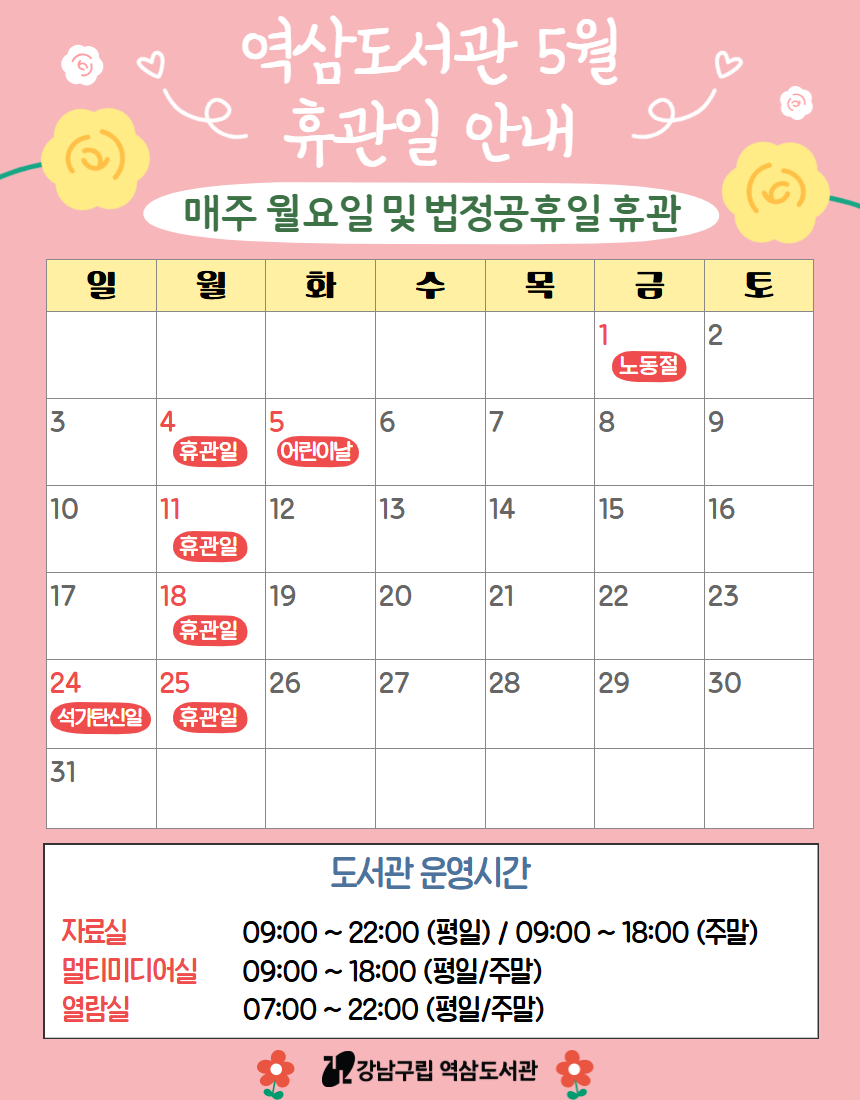 ☆ 역삼도서관 정기휴관일은 매주 월요일과 일요일을 제외한 법정 공휴일입니다.
