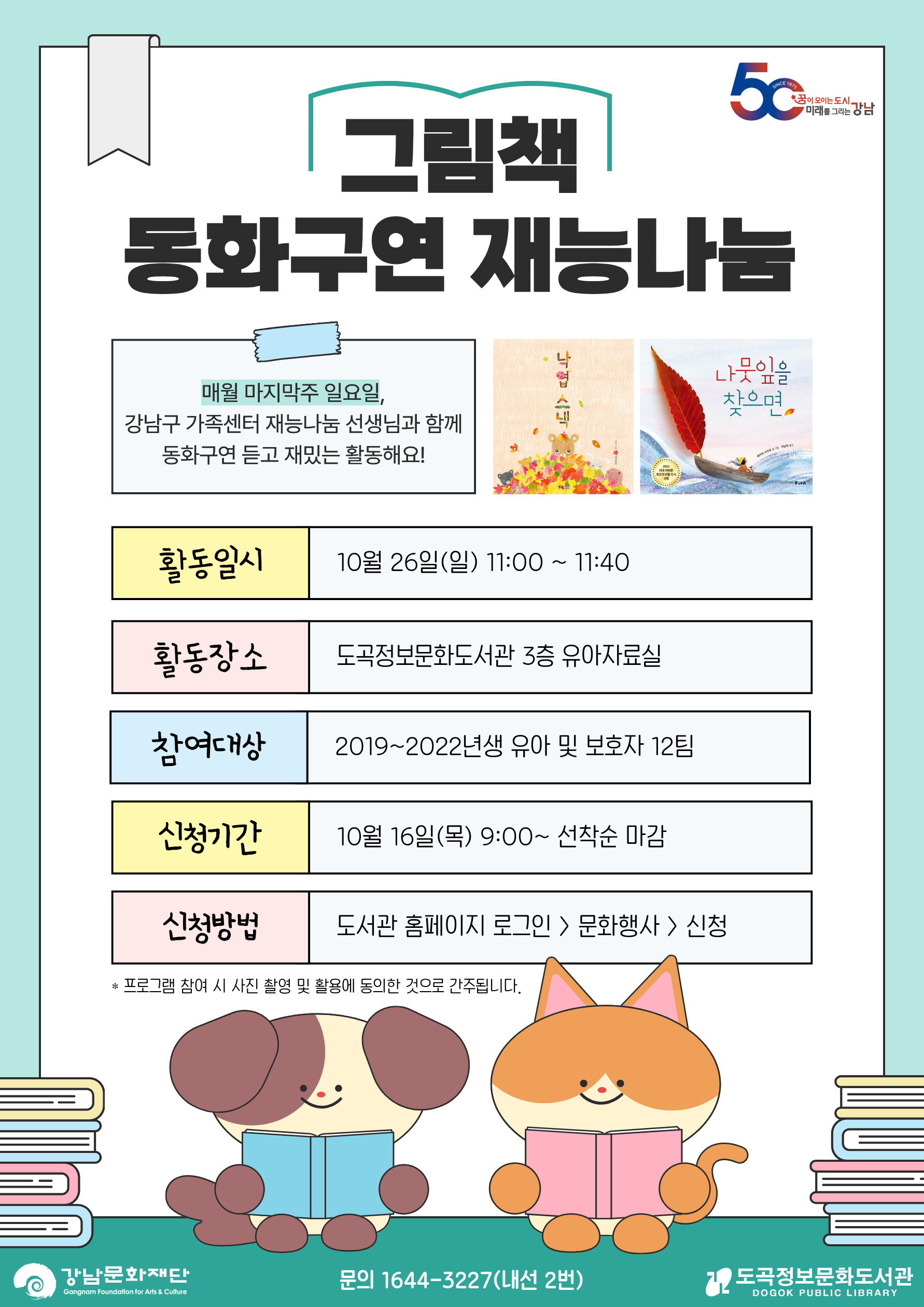 강남구 가족센터와 연계하여 그림책 동화구연 재능나눔 프로그램을 운영합니다! 도서 '낙엽스낵'과 '나뭇잎을 찾으면'을 읽고 🍂나뭇잎을 활용한 그림을 그려봐요! 사전접수 마감 시 현장접수가 불가합니다. 기존 신청자가 불참하는 경우에만 현장접수 받을 예정입니다. ![]() ![]() |