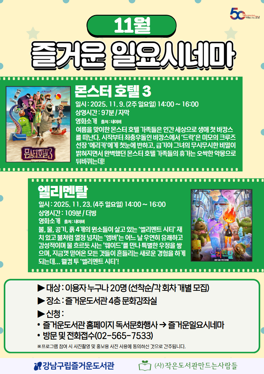| 행사명 | 즐거운 [대면] 2025년 11월 즐거운 일요시네마 - 몬스터 호텔 3, 엘리멘탈 |