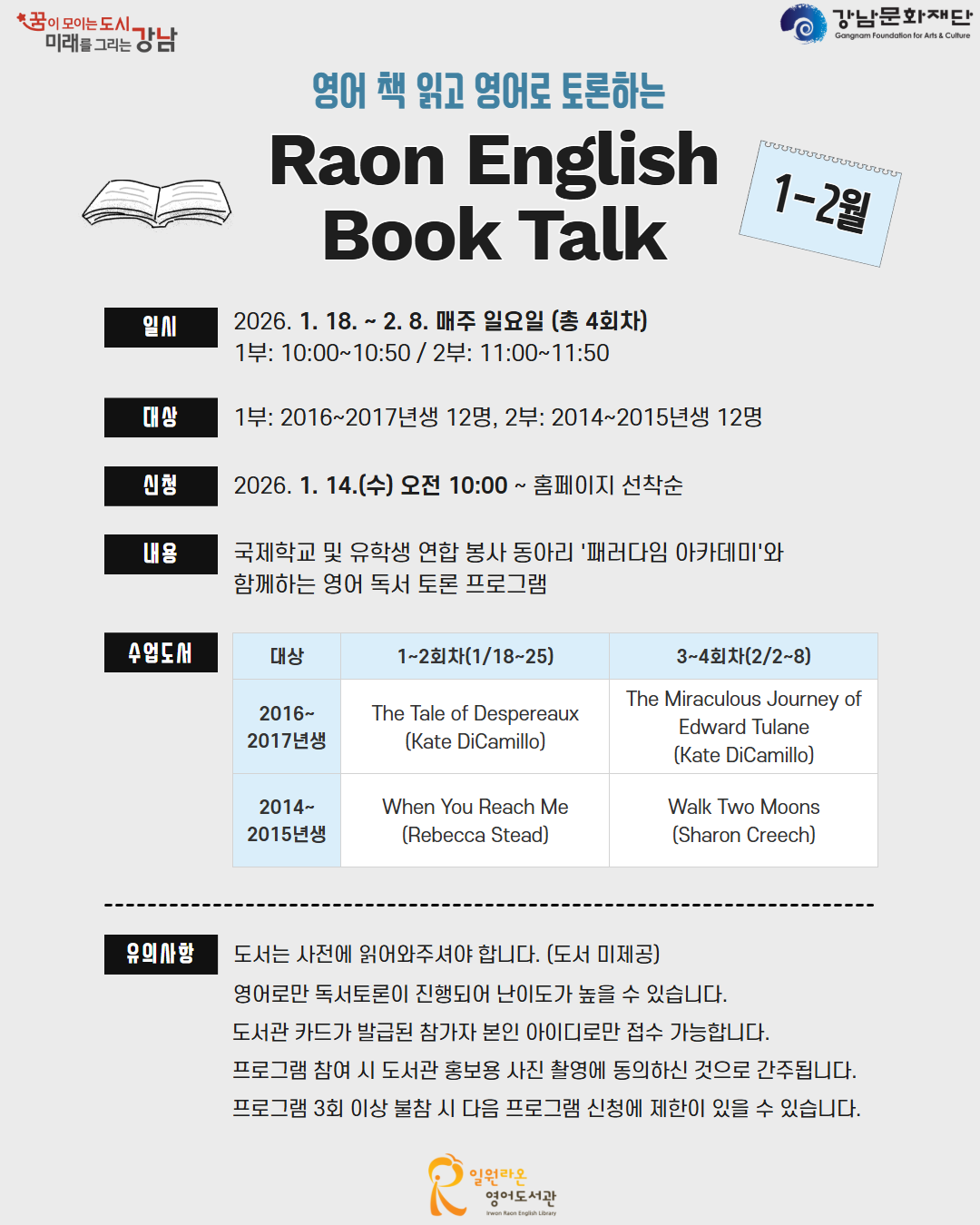 | 행사명 | 일원라온영어 2026년도 1-2월 RAON ENGLISH BOOK TALK - 2부 |