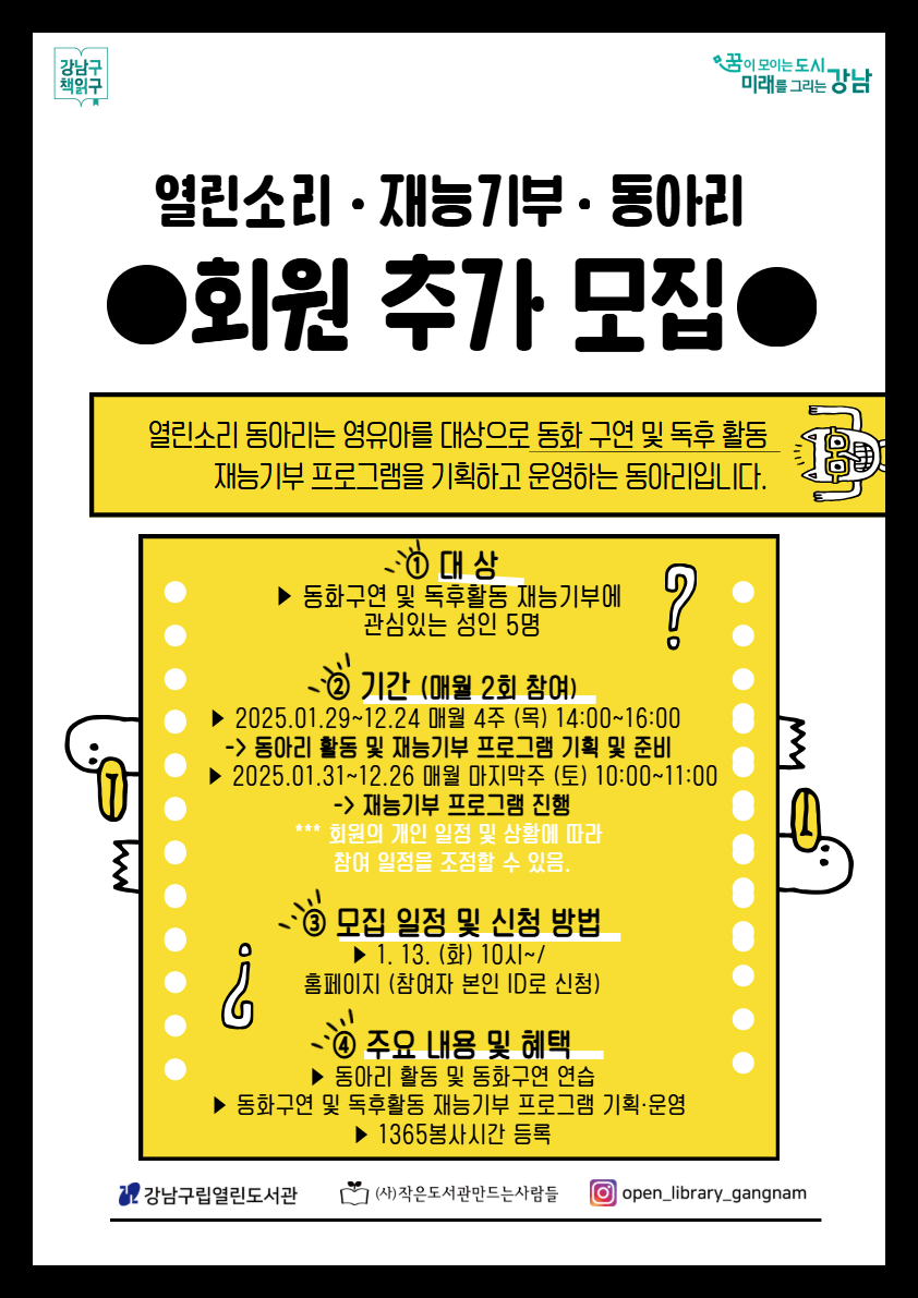 🤗열린소리 재능기부 동아리 회원 추가 모집🤗 아이들에게 책 읽는 즐거움과 따뜻한 이야기를 전하는 열린소리 재능기부 동아리에서 함께할 회원을 모집합니다. 📌 열린소리 동아리는 영유아를 대상으로 동화 구연과 독후 활동을 통해 책과 친해질 수 있는 재능기부 프로그램을 기획·운영하고 있습니다. 정기 모임은 매월 넷째 주 (목) 14:00~16:00에 진행되며, 동아리 활동과 재능기부 프로그램을 함께 기획하고 준비합니다. 재능기부 프로그램은 매월 마지막 주 (토) 10:00~11:00에 운영되며, 영유아를 대상 그림책 동화 구연 및 독후 활동을 진행합니다. 📌 정기 모임 필수 참석 동아리의 원활한 운영과 재능기부 프로그램 준비를 위해 매월 넷째 주 (목) 14:00~16:00 정기 모임은 반드시 참여해 주셔야 합니다. ※ 재능기부 프로그램 참여는 회원 개인의 상황에 따라 일정 조정이 가능합니다. 아이들과의 따뜻한 만남을 함께 만들어 가고 싶은 분들의 많은 관심과 참여를 기다립니다. ![]() |