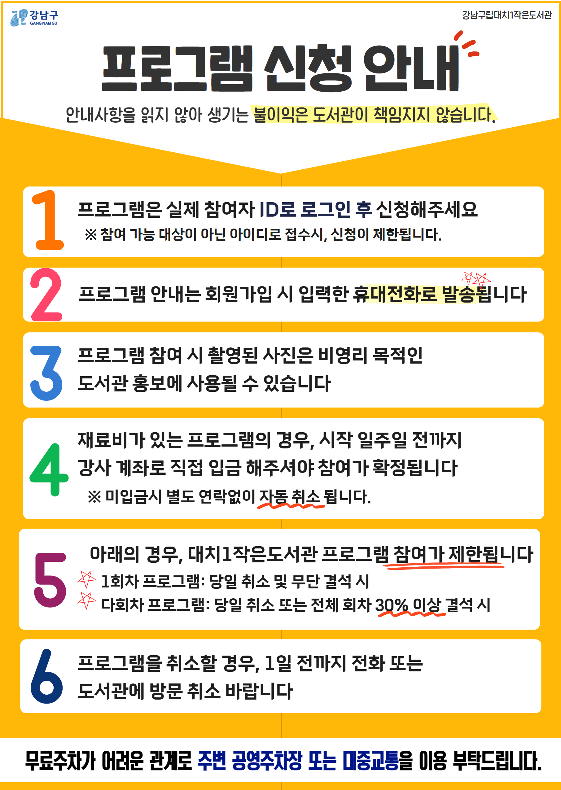[성인 독서동아리 도비채 2026년 회원 모집] 함께 읽고 토론하는 성인 독서동아리 "도비채"에서 2026년 회원을 모집합니다. 관심있는 분들의 신청을 기다리고 있습니다. ![]() ![]() □ 동아리명 : 성인독서동아리 "도비채" □ 활동기간 : 2026년 3월 ~ 12월 □ 일 시 : 매월 첫 번쨰 수요일 오전 10시 ~ 12시 □ 장 소 : 대치1작은도서관 동아리실 □ 신청방법 : 대치1작은도서관 홈페이지-문화행사 (참가하는 본인 ID로 로그인 후 신청버튼 클릭) □ 문 의 : (02) 3452-1170 ※ 프로그램 관련 공지사항은 문자로 발송되오니 회원가입 시 입력된 휴대폰번호 확인 부탁드립니다. ※ 본 프로그램 신청은 정회원을 기준으로 하기 때문에 처음이신 분은 홈페이지 가입 후 도서관에 방문하셔서 대출증을 만드셔야 합니다. - <도서관 운영시간> : 화~일 오전 9시~오후 6시(휴관일: 매주 월요일 및 공휴일) ※ 프로그램 신청 시 홍보용 사진 촬영 및 사용에 동의하시는 것으로 간주됩니다. |