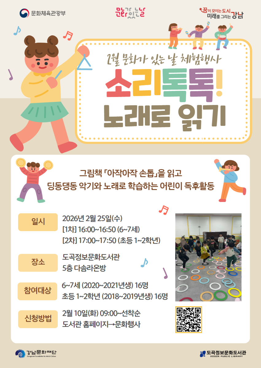 | 행사명 | 도곡정보 [문화가 있는 날] 2월 체험행사 <소리톡톡! 노래로 읽기> 2차 (17:00~17:50) |