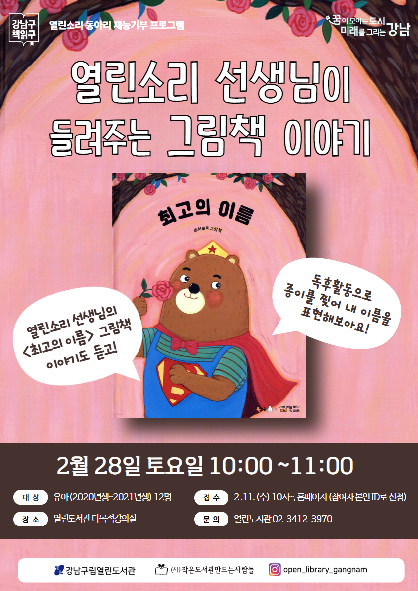 | 행사명 | 열린 [대면] 열린소리 선생님이 들려주는 그림책 이야기 : 최고의 이름 |