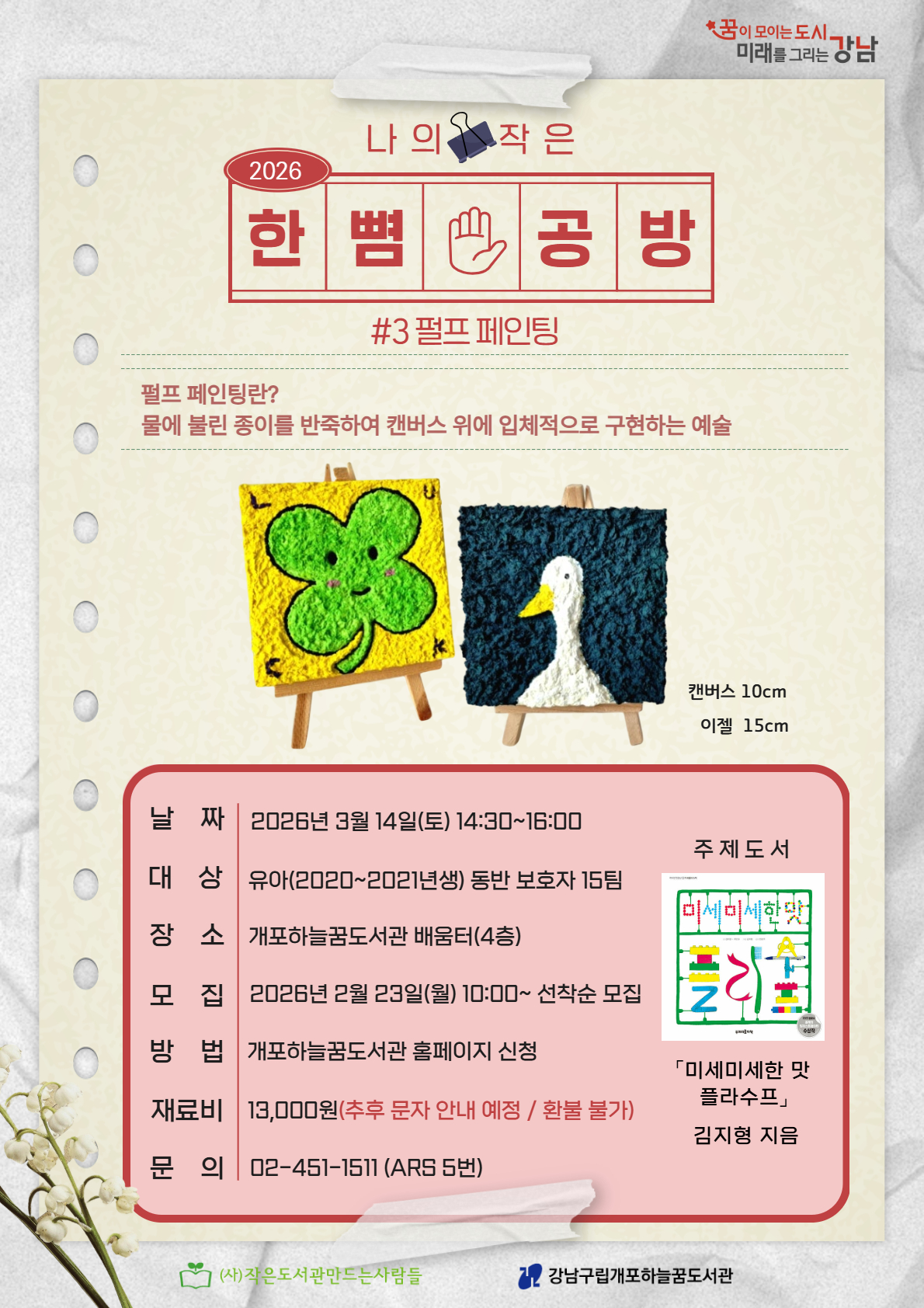 | 행사명 | 개포하늘꿈 [배움] 2026 나의 작은 한뼘 공방 #3 펄프 페인팅 |