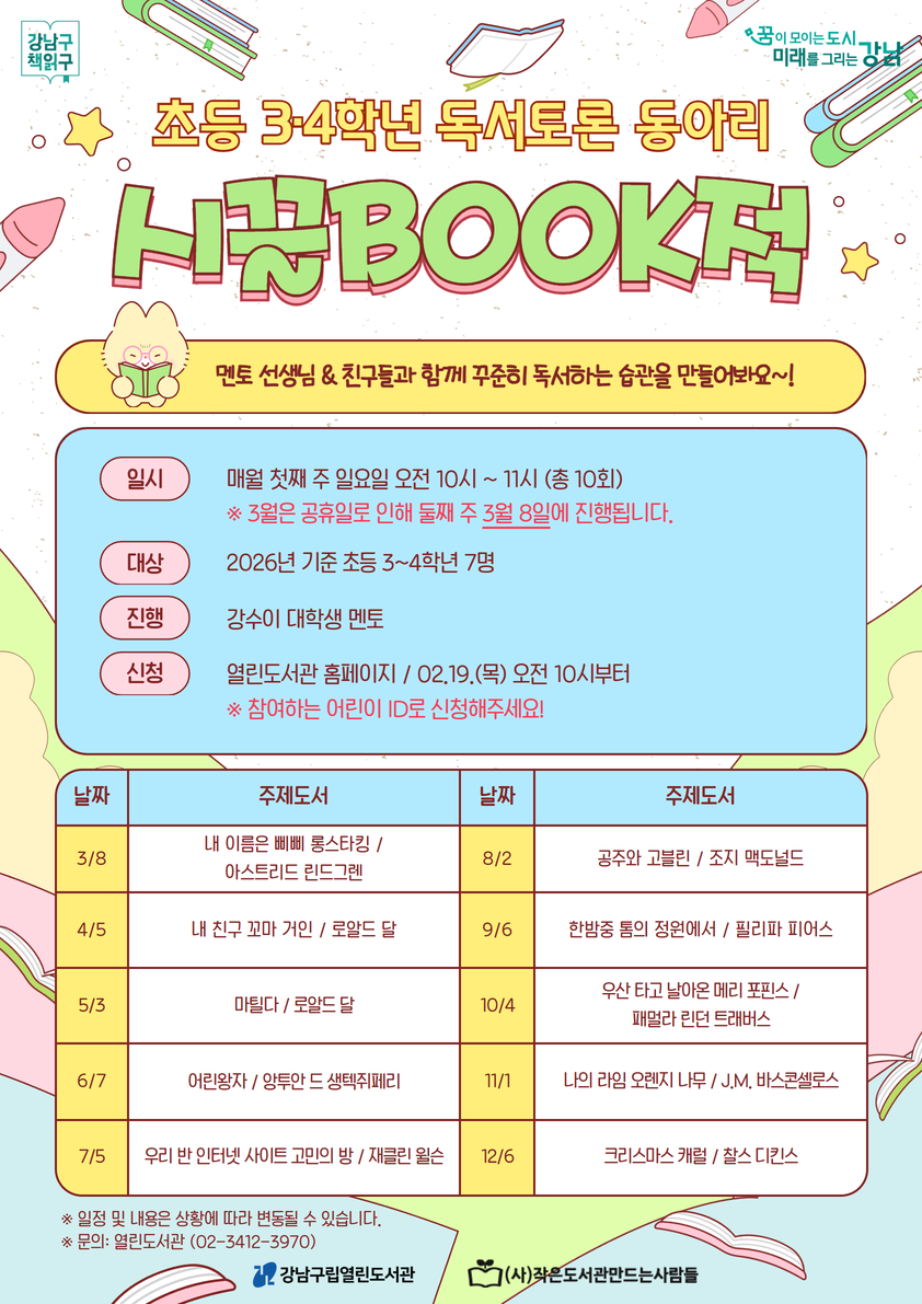 <시끌BOOK적>은 매달 한 권의 주제도서를 읽고 모여 다양한 독후활동을 진행하는 동아리입니다. 대학생 멘토 선생님, 또래 친구들과 함께 꾸준한 독서 습관을 만들어봐요~! ※ 3월은 공휴일로 인해 둘째 주 3월 8일에 진행됩니다. ※ 꾸준히 참여할 수 있는 경우에만 신청해주세요. 무단 결석 시 이후 참여가 제한됩니다.