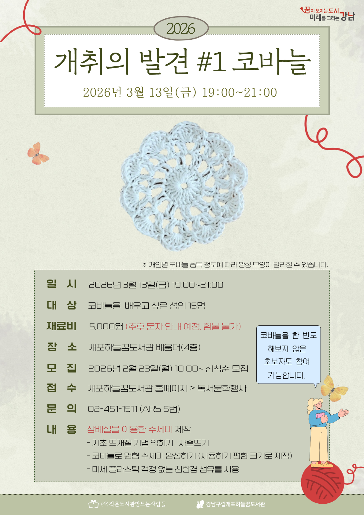 | 행사명 | 개포하늘꿈 [배움] 2026 개취의 발견 #1 코바늘 |
