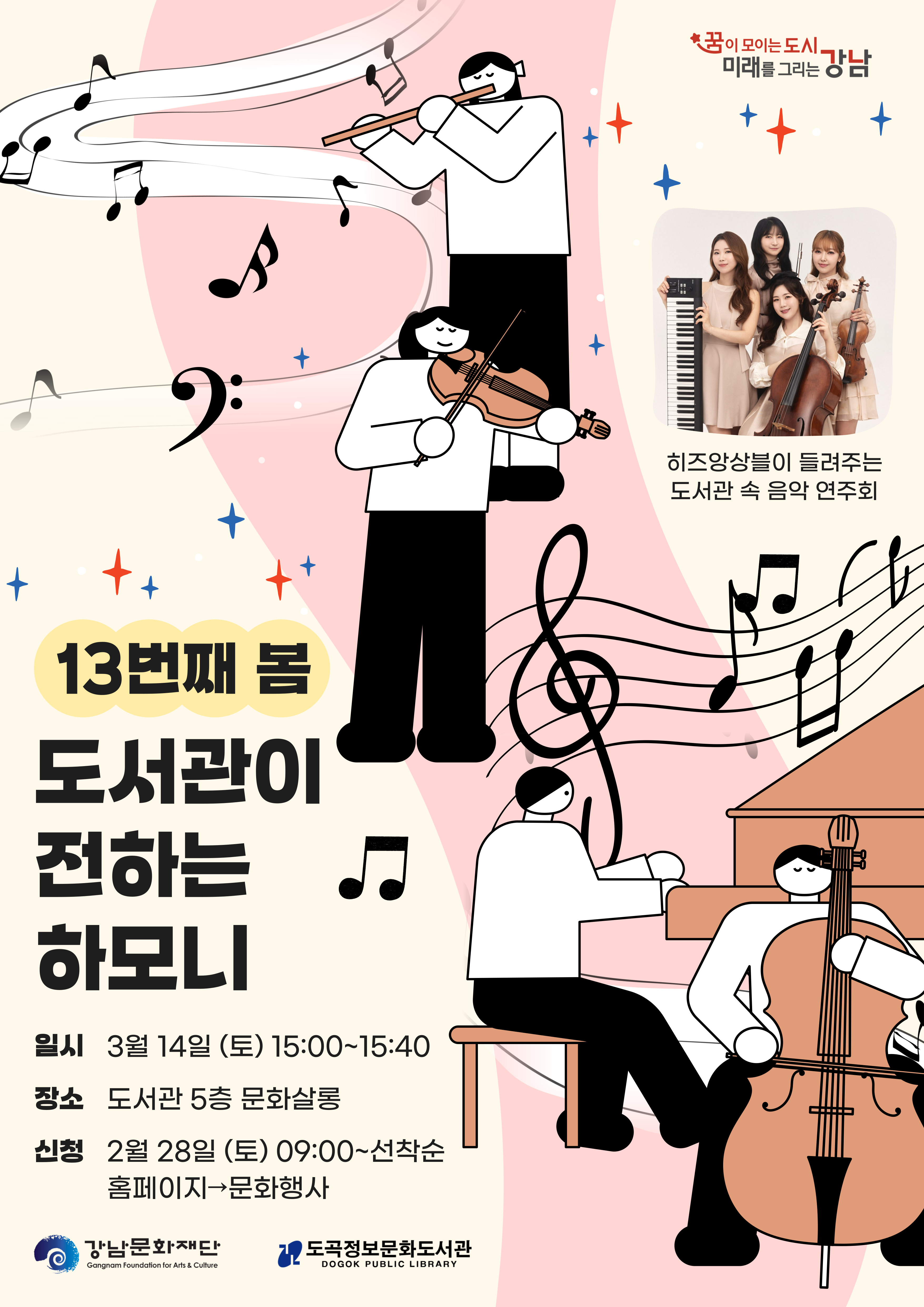 | 행사명 | 도곡정보 [개관13주년 기념행사] 도서관 음악회 <13번째 봄, 도서관이 전하는 하모니> |