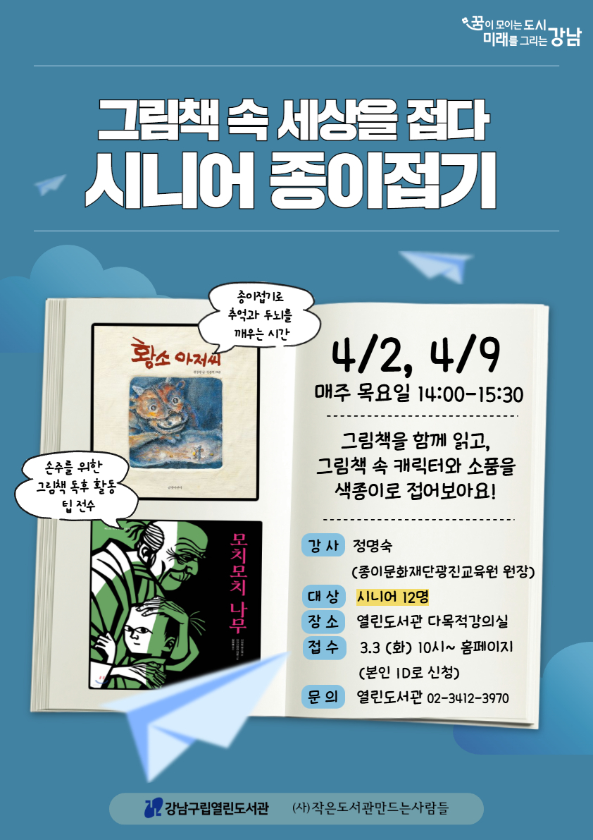 * 50세 이상 시니어 프로그램입니다. 그림책 속 세상을 접다: 시니어 종이접기📚🖼️ 「그림책 속 세상을 접다」는 그림책을 함께 읽고, 이야기 속 캐릭터와 소품을 종이접기로 직접 완성해보는 프로그램입니다. 이번 기회에 손과 마음이 함께 힐링되는 특별한 시간을 가져보세요! ▶ 종이접기로 추억과 두뇌를 깨우는 시간! ✂️📄✨ ▶ 손주와 더 가까워지는 그림책 독후활동 비법도 알려드립니다 📖 시니어 여러분의 많은 관심과 신청 바랍니다. 🌷 * 프로그램 내용 - 4/2 (3회차) 황소 아저씨 (권정생 저/ 길벗어린이) / 다양한 동물 접기 - 4/9 (4회차) 모치모치나무 (사이토 류스케 저/ 주니어RHK) / 사랑스러운 초록나무 접기 ![]() ※ 참여하는 본인의 아이디로 신청해주세요. ※ 프로그램 관련 공지사항은 문자로 발송되오니, 회원가입 시 입력된 휴대폰번호 확인 부탁드립니다. ○ 일시 : 2026년 4월 2일, 4월 9일 (매주 목) 14:00 ~ 15:30 (총 2회) ○ 대상 : 50세 이상 12명 ○ 장소 : 열린도서관 다목적강의실 ○ 신청방법 : 열린도서관 홈페이지 (로그인 후 아래 행사신청 버튼을 눌러주세요!) ○ 문의 : 열린도서관 (02-3412-3970) |