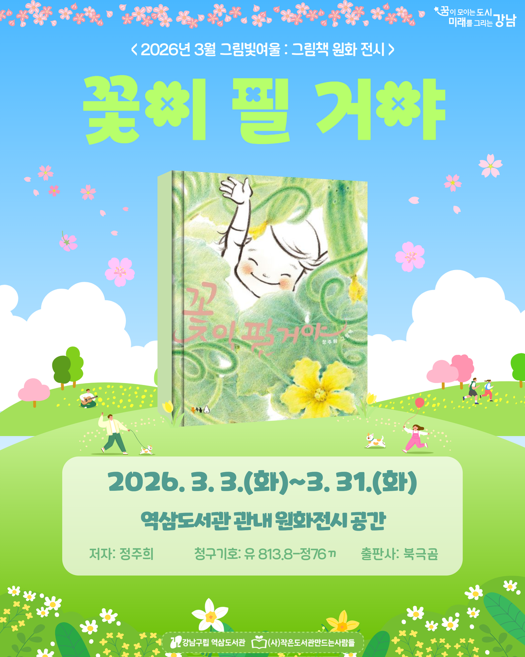 매월 다른 원화를 역삼도서관에서 만나보세요! 3월에는 <꽃이 필 거야> 원화가 전시됩니다. |