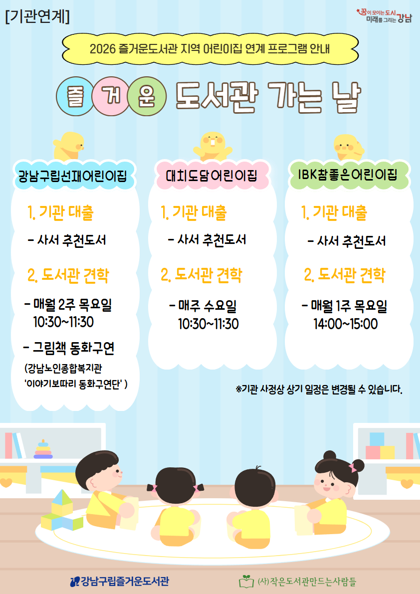 ※본 프로그램은 지역 어린이집 기관연계 프로그램으로 별도의 모집을 받지 않습니다. [기관연계][2026 즐거운도서관 어린이 견학 프로그램- '즐거운' 도서관 가는 날]