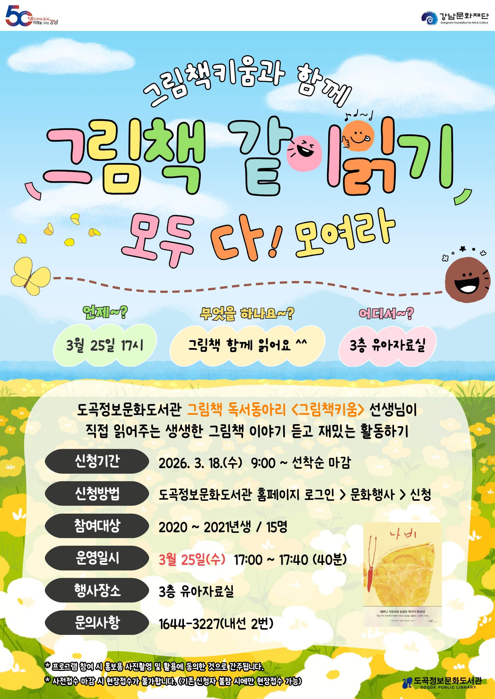 | 행사명 | 도곡정보 [재능기부] 그림책키움과 함께 그림책 같이 읽기(3월) |