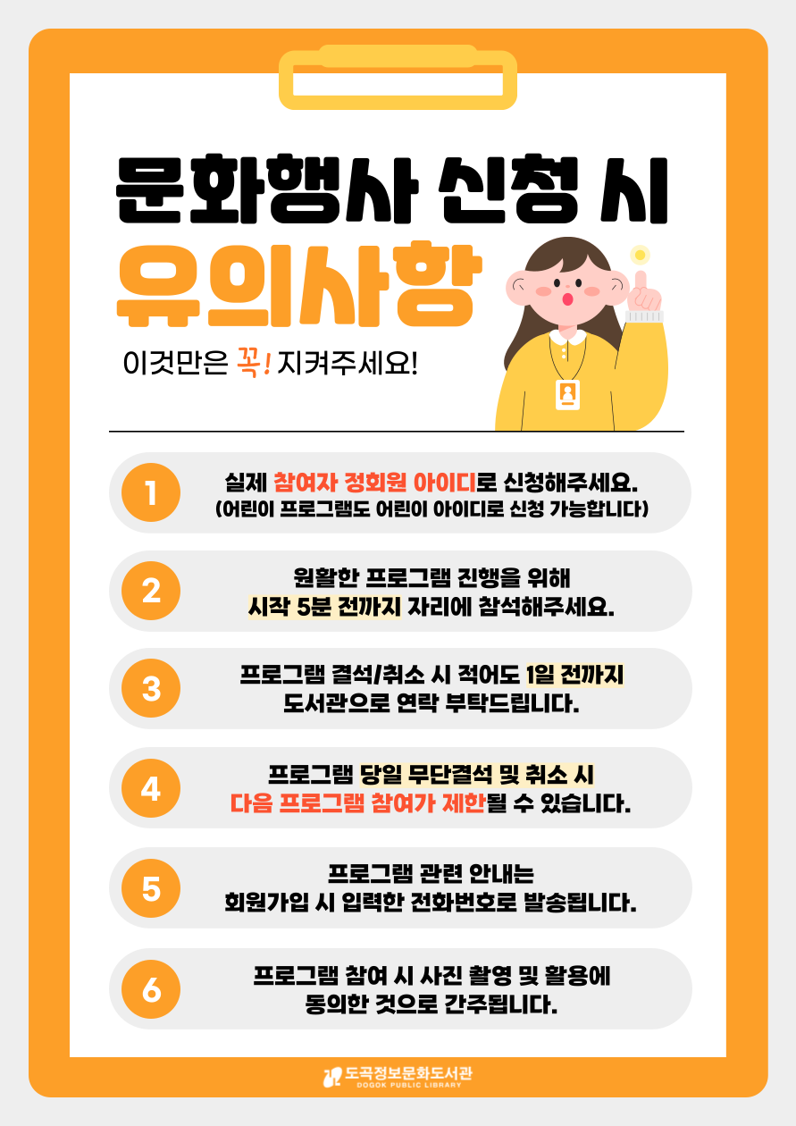 도서 '🦋나비'를 읽고 요술 종이나비 만들기 독후활동을 진행해보아요! 사전접수 마감 시 현장접수가 불가합니다. 기존 신청자가 불참하는 경우에만 현장접수를 받을 예정입니다. ![]() ![]() |