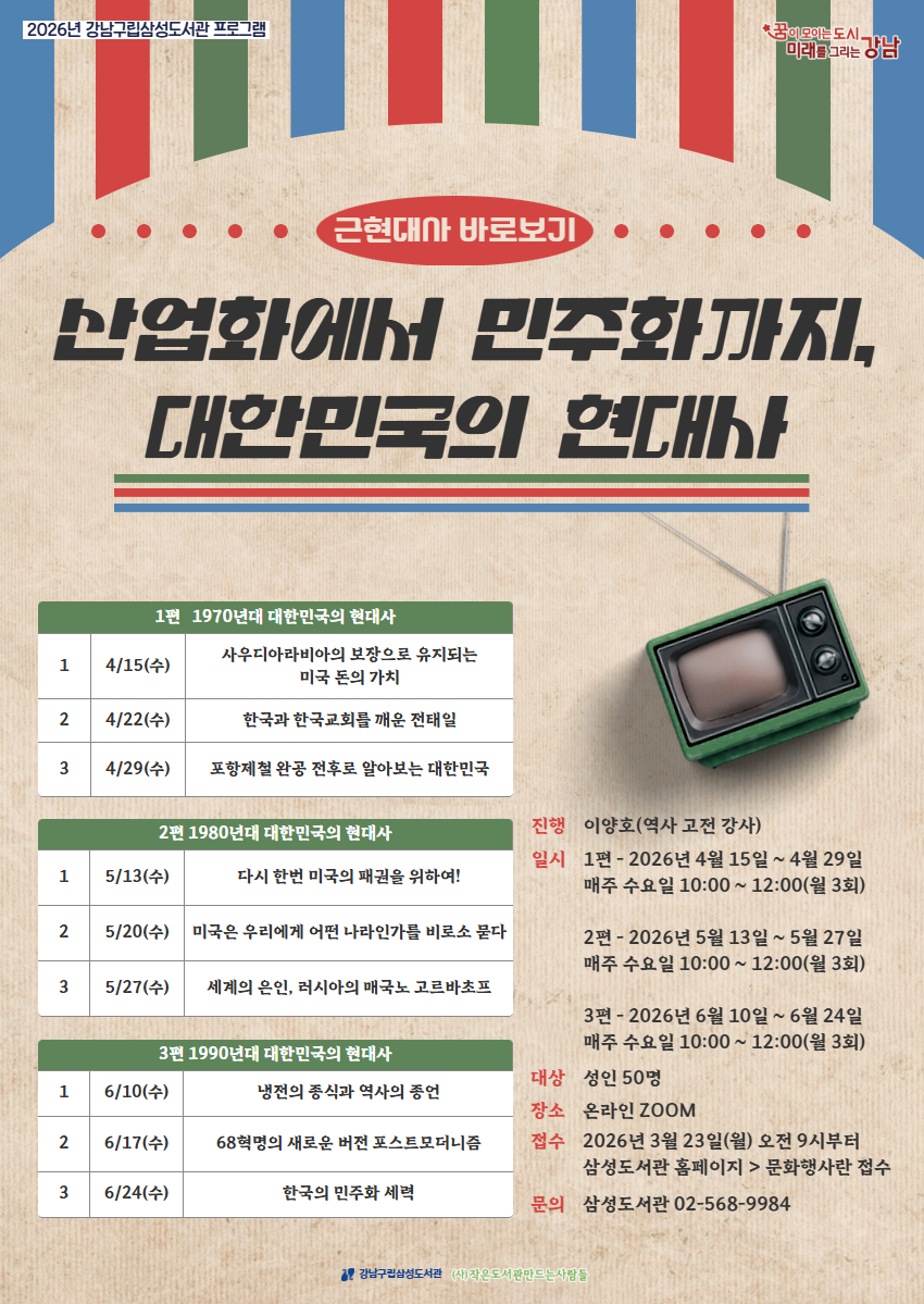 | 행사명 | 삼성 [2026년 삼성도서관 프로그램] 근현대사 바로보기 - 산업화에서 민주화까지, 대한민국의 현대사 |