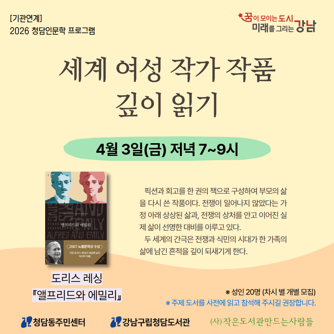| 행사명 | 청담 [기관연계][2026 청담인문학][추가모집] 세계 여성 작가 작품 깊이 읽기 : 도리스 레싱 『앨프리드와 에밀리』 |