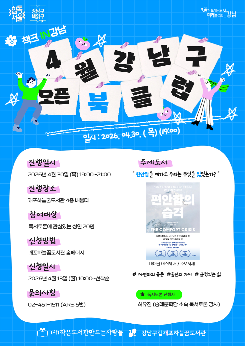 | 행사명 | 개포하늘꿈 [배움] 강남구책읽구 : 4월 강남구 오픈 북클럽 책크in강남 |