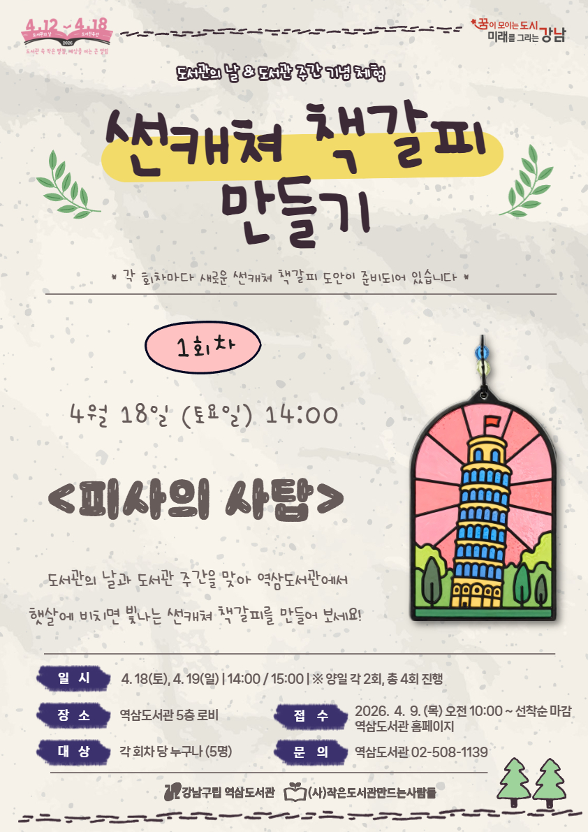 | 행사명 | 역삼 [도서관 주간] 썬캐쳐 책갈피 만들기 (1회차) - 피사의 사탑 |