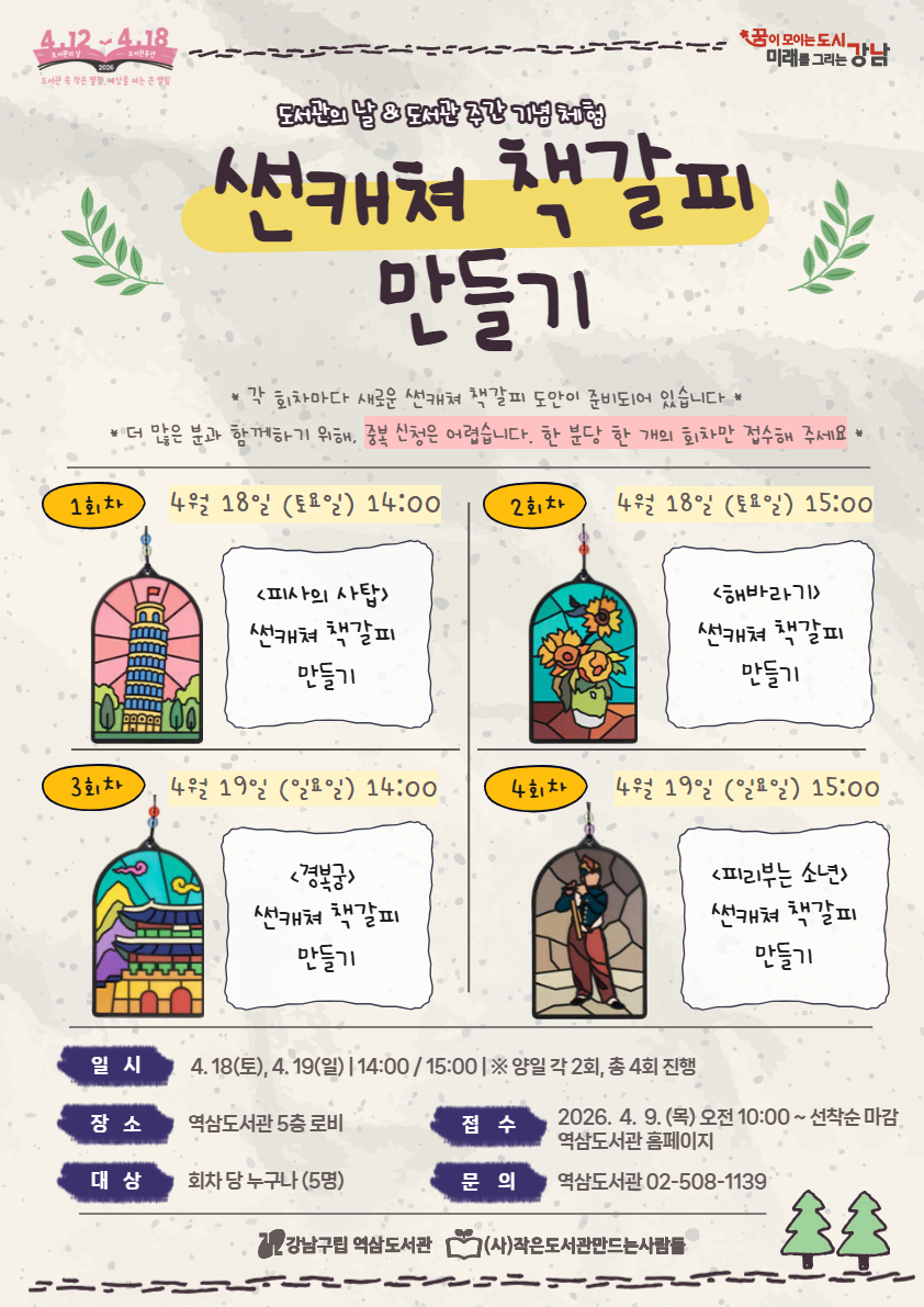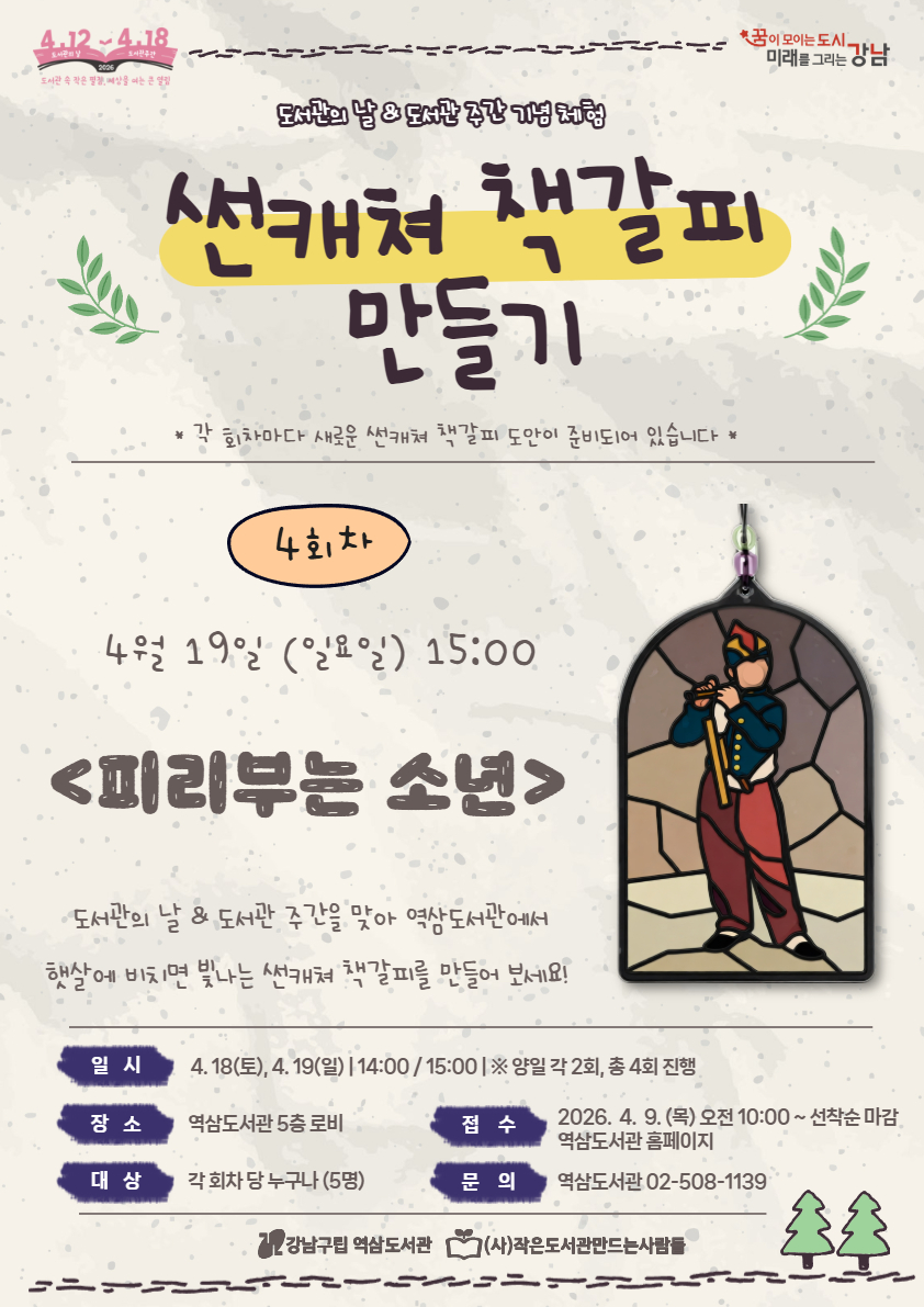 | 행사명 | 역삼 [도서관 주간] 썬캐쳐 책갈피 만들기 (4회차) - 피리부는 소년 |