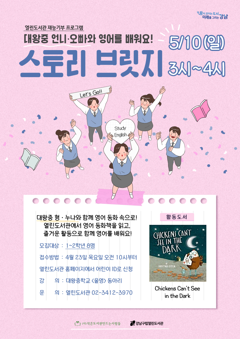 대왕중 형·누나와 함께 영어 동화 속으로! 열린도서관에서 영어 동화책을 읽고, 즐거운 활동으로 함께 영어를 배워요! 중학생 멘토와 함께 영어 책을 읽고 독후 활동으로 신나게 영어와 만날 친구들, 모두 오세요! 😊 ![]() ![]() |