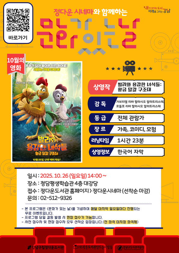 정다운시네마 10월의 영화 빌리와 용감한 녀석들: 황금 달걀 구조대 * 도서관 사정에 따라 상영작은 변경될 수 있습니다. ⏰ 일시 : 2025. 10. 26. (일요일) 14:00~ (*상영작 러닝타임에 따라 시간 변동이 있을 수 있습니다.) 📮 장소 : 청담평생학습관 4층 대강당 😽 대상 : 누구나 💻 접수 : 정다운도서관 홈페이지>정다운시네마 🎤 문의 : 02-512-9326(정다운도서관) 치킨 히어로 ‘빌리’ 아빠가 되어 돌아왔다! 황금 달걀 ‘맥스’와 ‘울리’ 남매의 아빠가 된 ‘빌리’ 아빠가 되었다는 기쁨도 잠시! 만찬 행사 경매를 위해 재료를 찾던 마피아들에게 황금 달걀 남매가 납치되자 ‘빌리’와 달걀 특공대는 뒤를 쫓아 아프리카 콩고로 향한다. 수많은 장애물과 한치 앞도 알 수 없는 위험이 넘치지만 아이들을 구하기 위해 구조대를 결성한 그들! 과연 ‘빌리’는 경매가 시작되기 전에 ‘맥스’와 ‘울리’ 남매를 구하고 평화로운 목장으로 돌아 갈 수 있을까? 이제부터 황금 달걀 구출 대작전이 시작된다! 🎬 신청 바로가기
